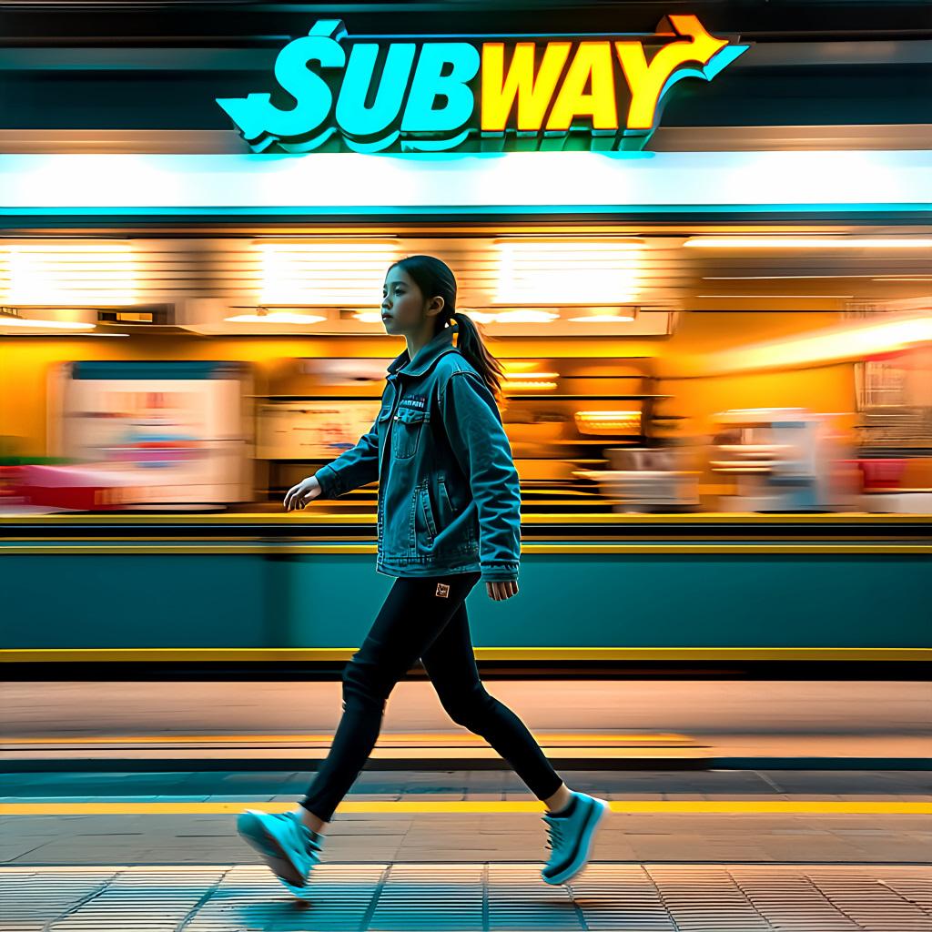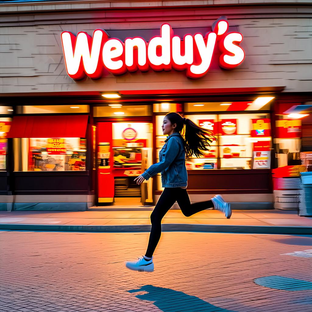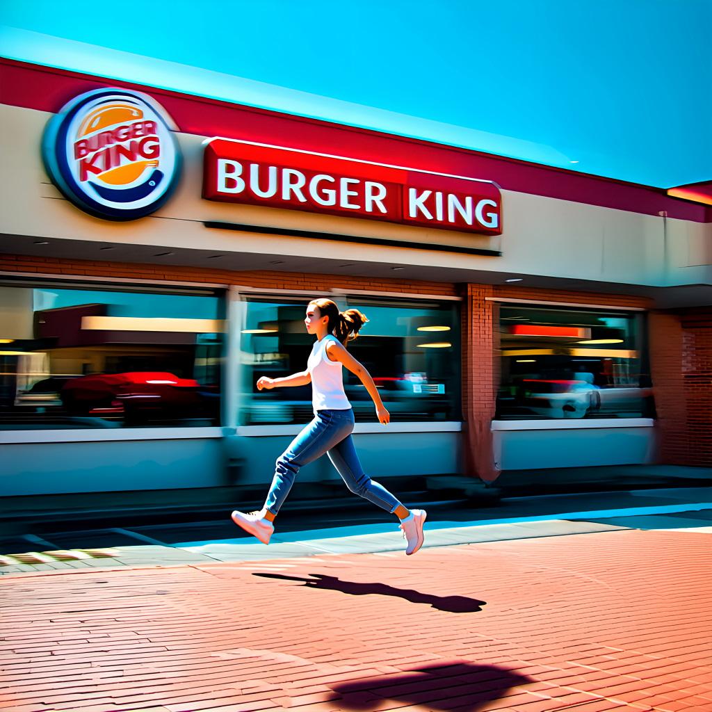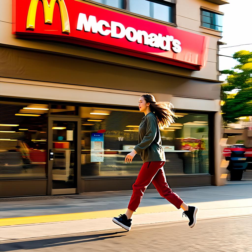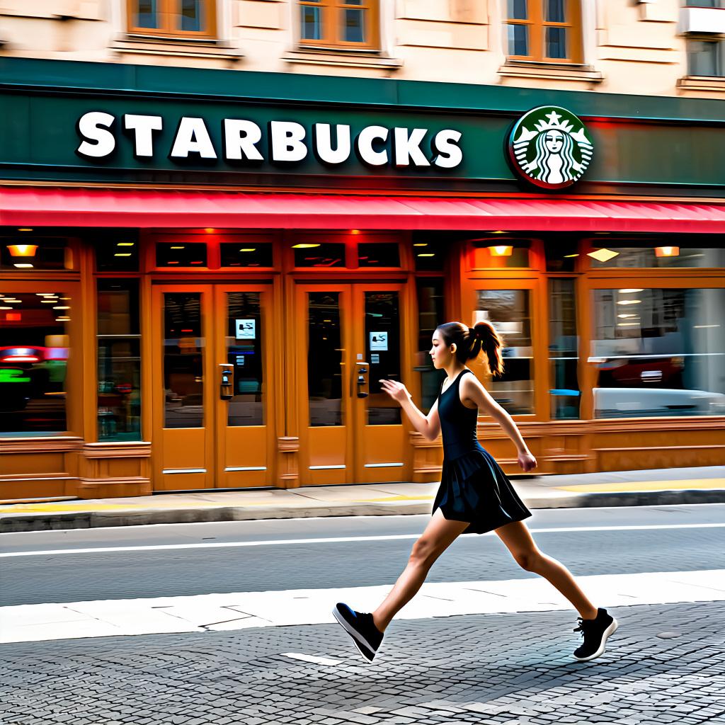 プロンプト「〇〇店の前を女の子が全速力で駆け抜けています」のみ。
