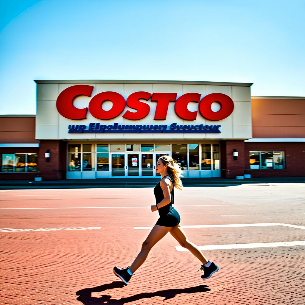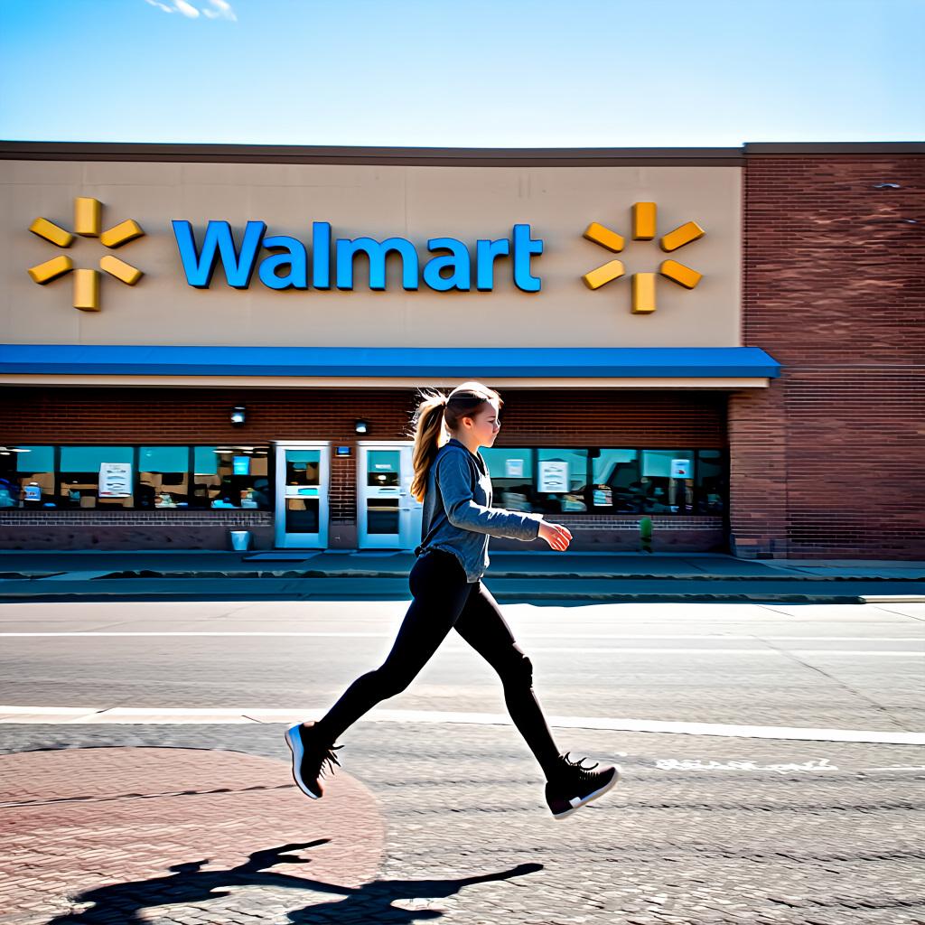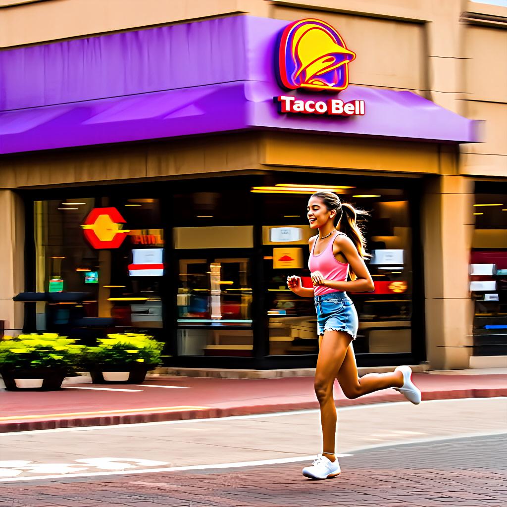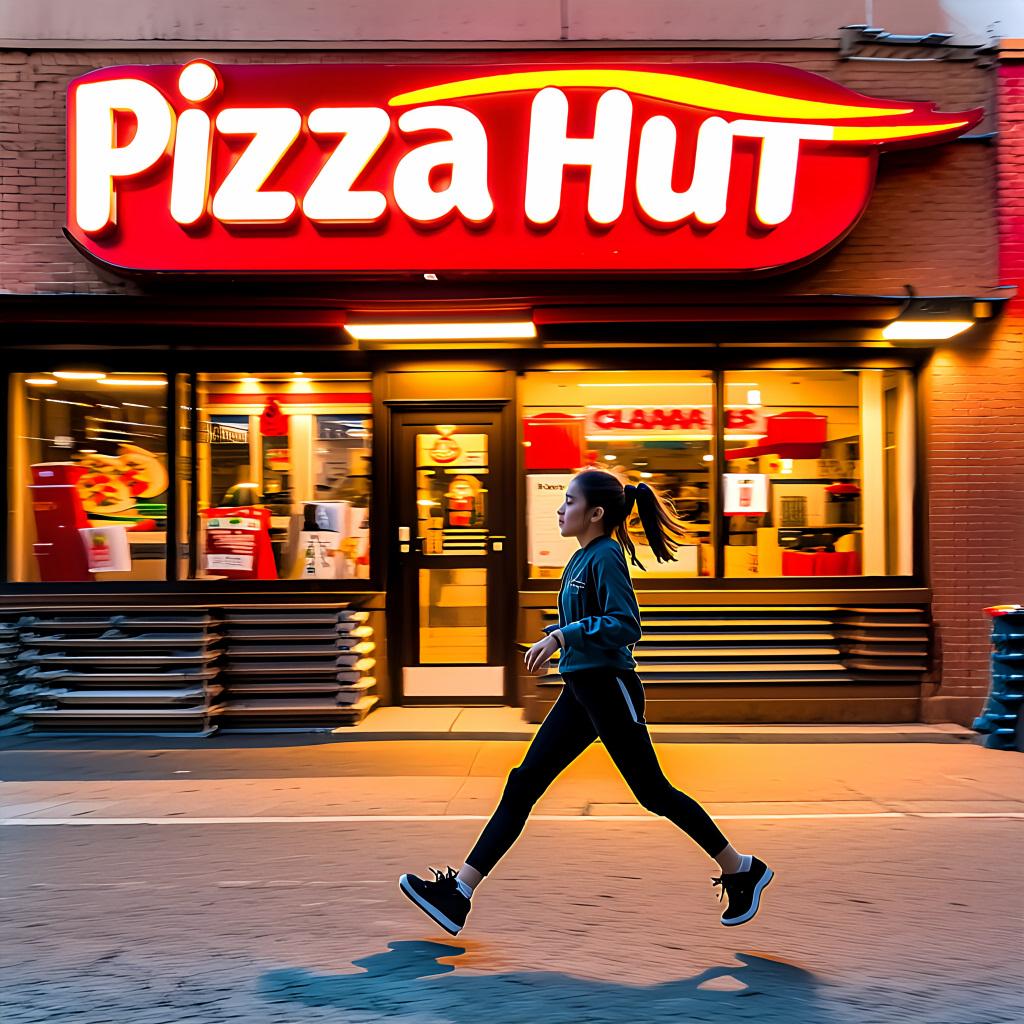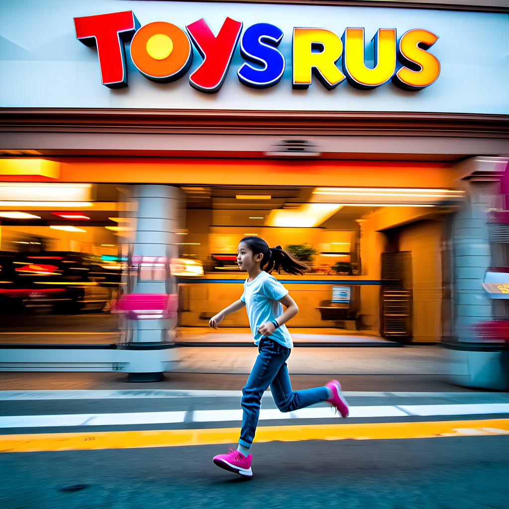 プロンプト「〇〇店の前を女の子が全速力で駆け抜けています」のみ。