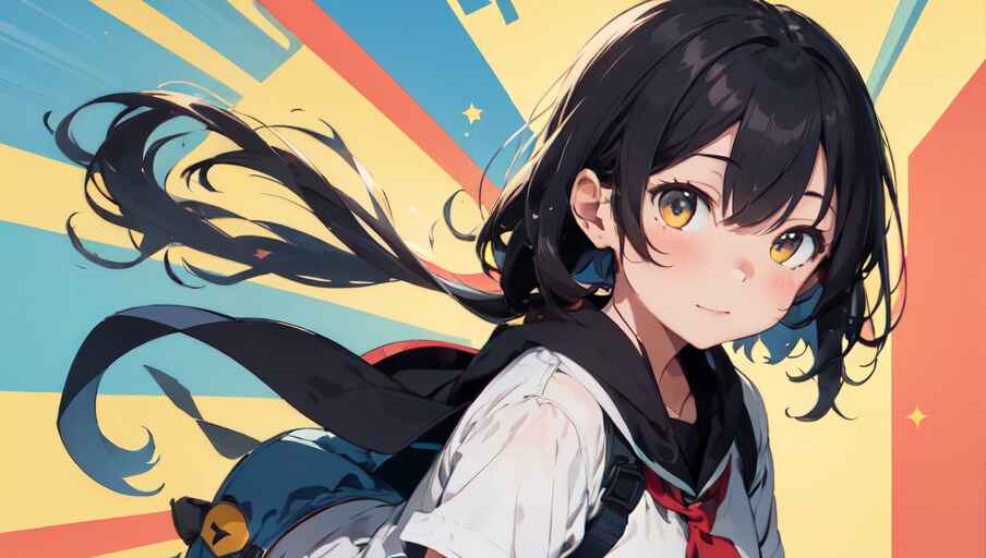 1girl, bowing, dynamic pose, coloful background, yellow theme, red theme,