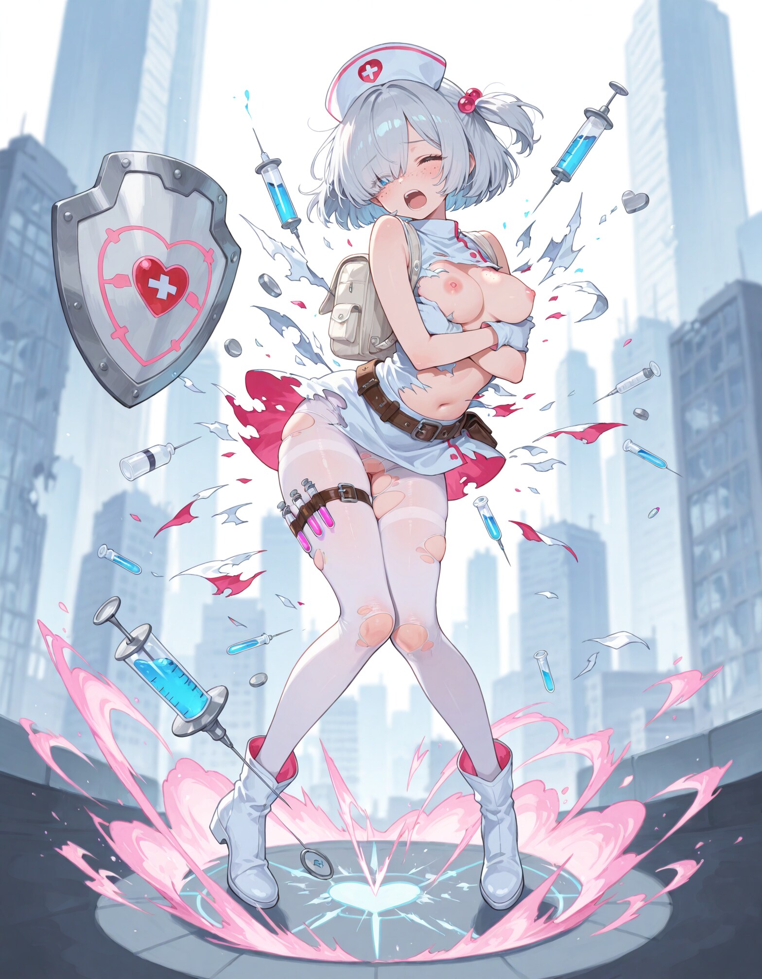 敵の攻撃で衣装がビリビリになってしまうまじかるナース少女ちゃん!