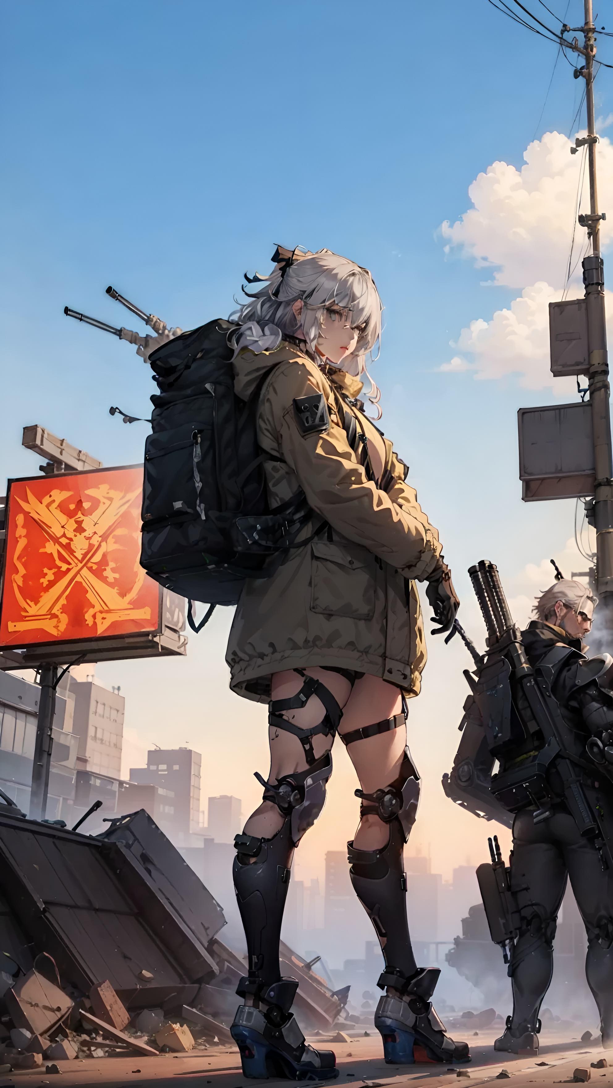 ☑️ヒント➡️幾多の戦いにより、足を無くした美少女アーミー、行動は常に上官と共にする。(演奏)(青空)(風)(動作)((重要な内容:彼女足))(失った足、光学技術者達により、回復、しかし、足には機動フレームとスライド式アーマーを搭載する必要がある、風に靡か突き進む背景は旋律の痕跡の廃墟))