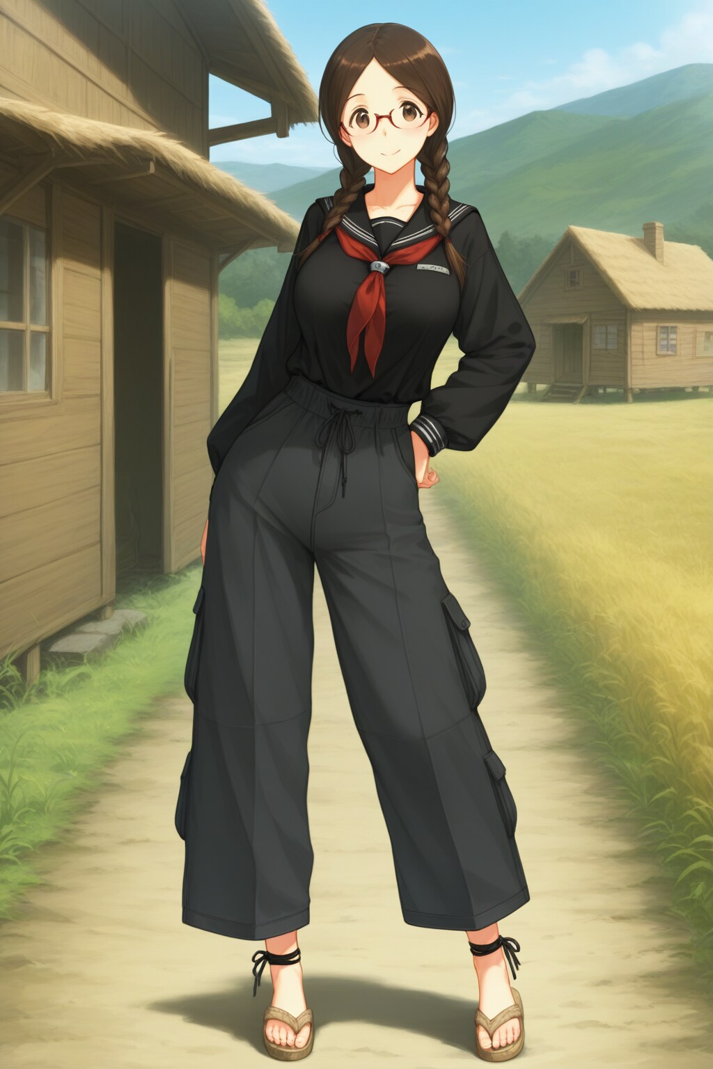 もんぺだけど…さすがに今どきのルーズパンツっぽくないかしら(苦笑)。現代でももんぺって売ってるけど太ももからかなりゆったりして動きやすそうよね」