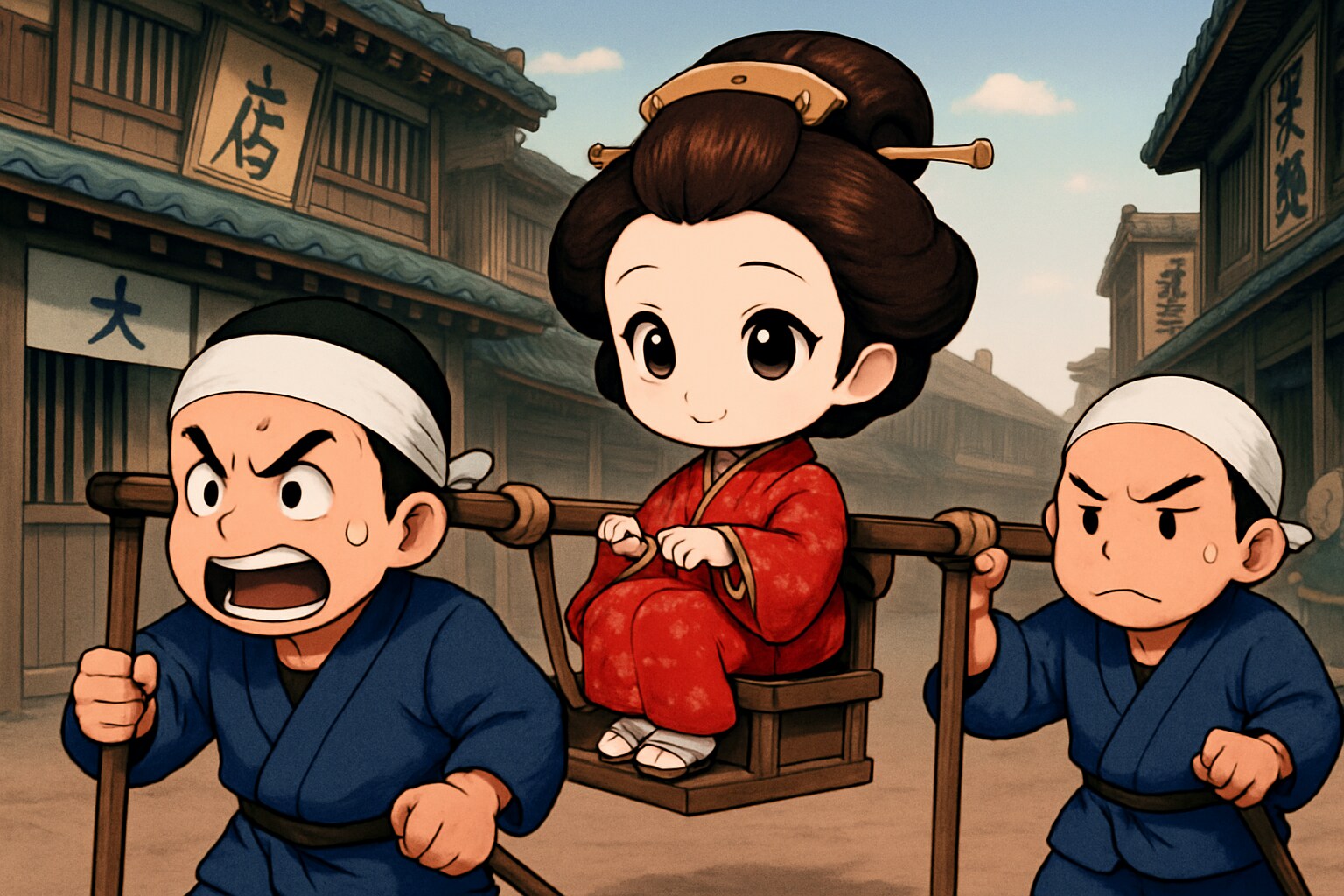籠本体の外観を描くと籠が大きくなってしまって、担ぎ手の肩から離れてしまうのでこうなりました。