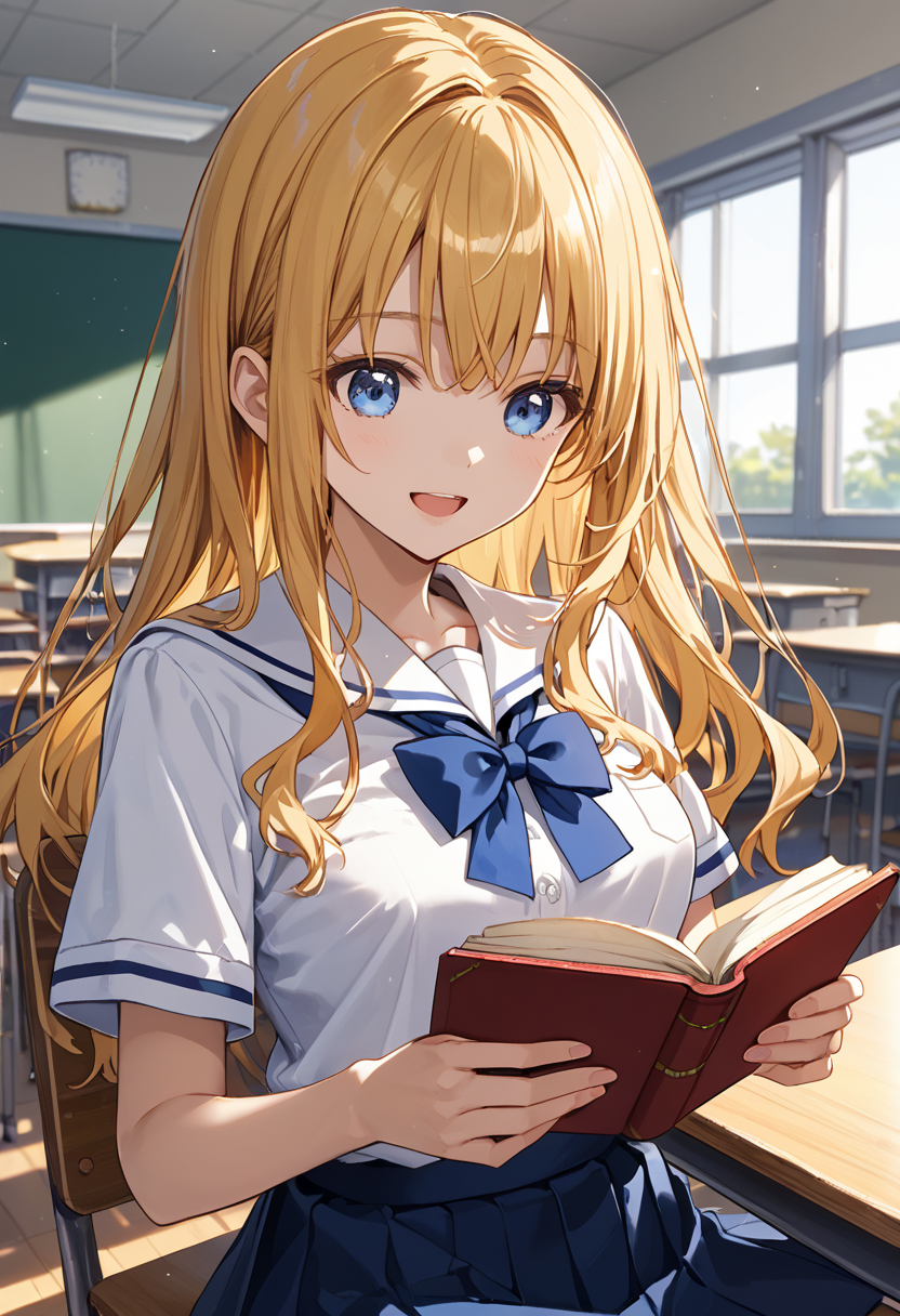 1girl,bangs,medium breasts,blue eyes,yellow long hair, white thighhighs,