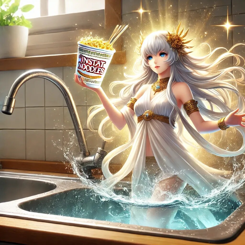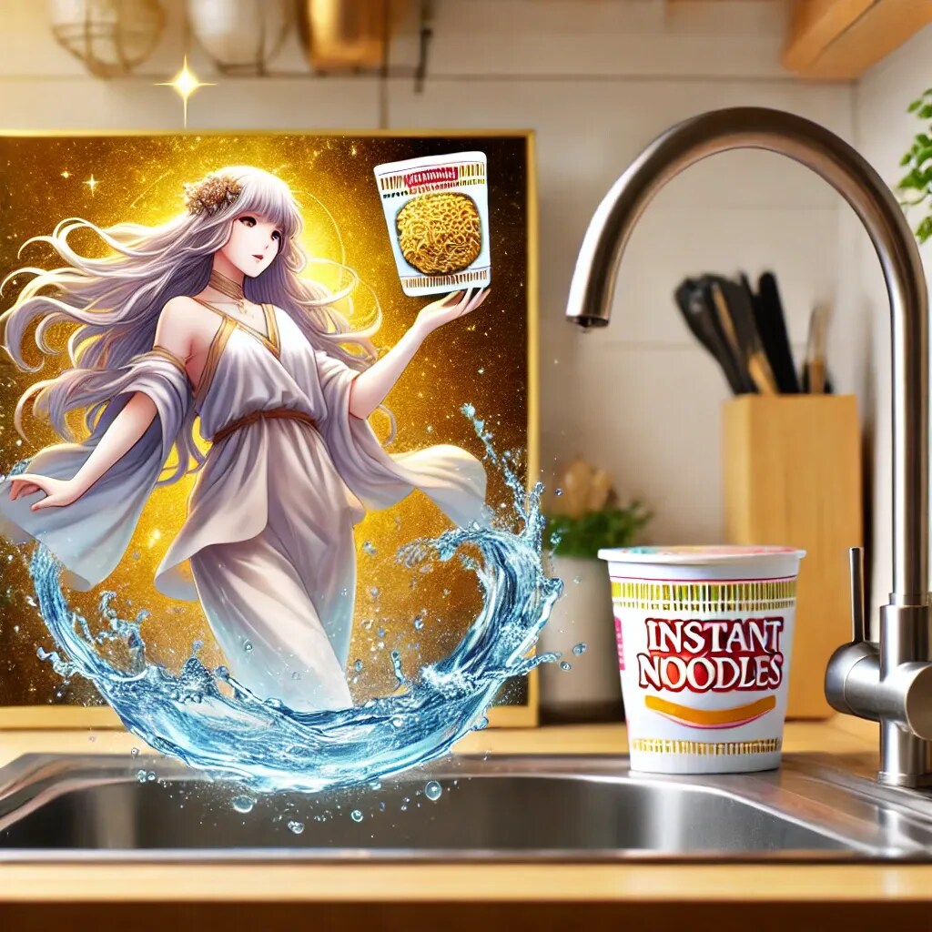 湯切りに失敗した瞬間、女神がシンクから現れて金のカップ麺を差し出してくれるなんて、まるで夢のようなシーンです。