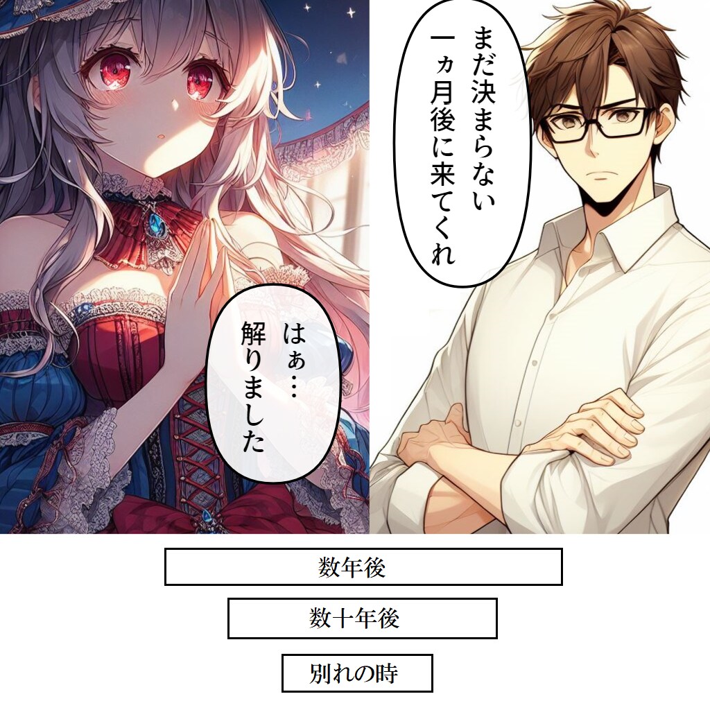 男 「まだ願いが決まらない。また一ヵ月後に来てくれないか?」