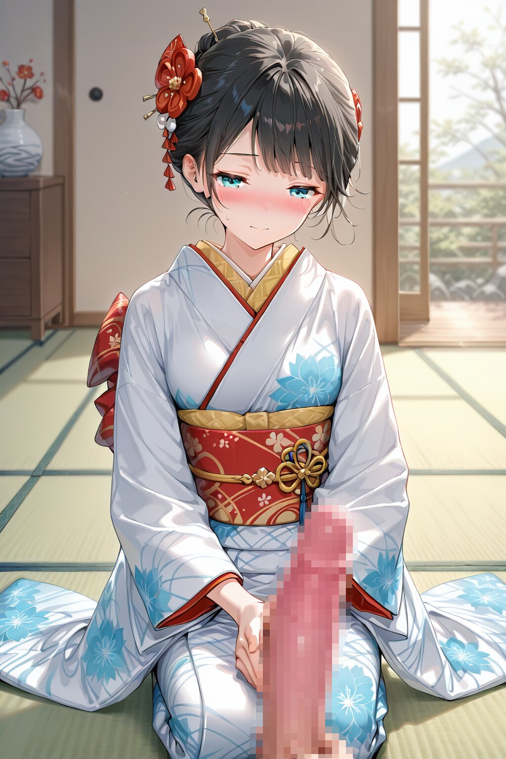 2,つくしを右手にとり、左手を玉袋に添え、つくしを鑑賞します