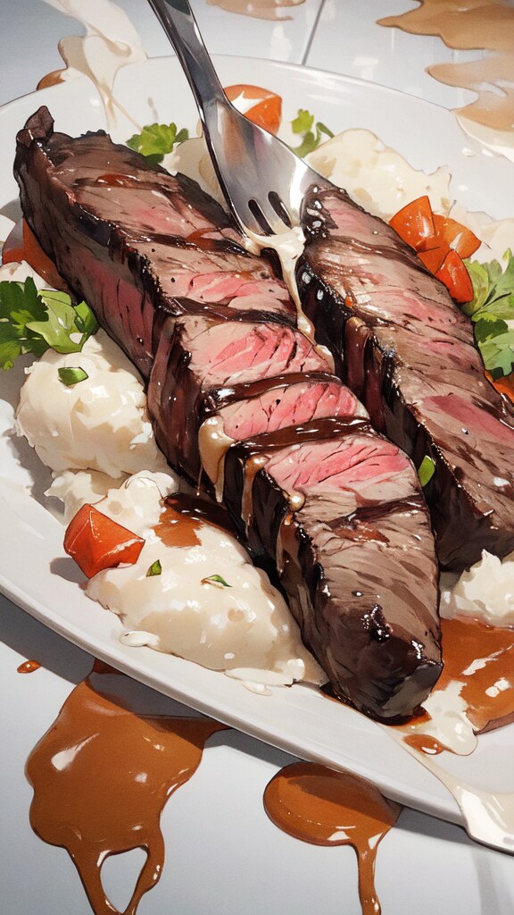 子羊のステーキでございます。非常にジューシーなのでサッパリしたソースで召し上がれ