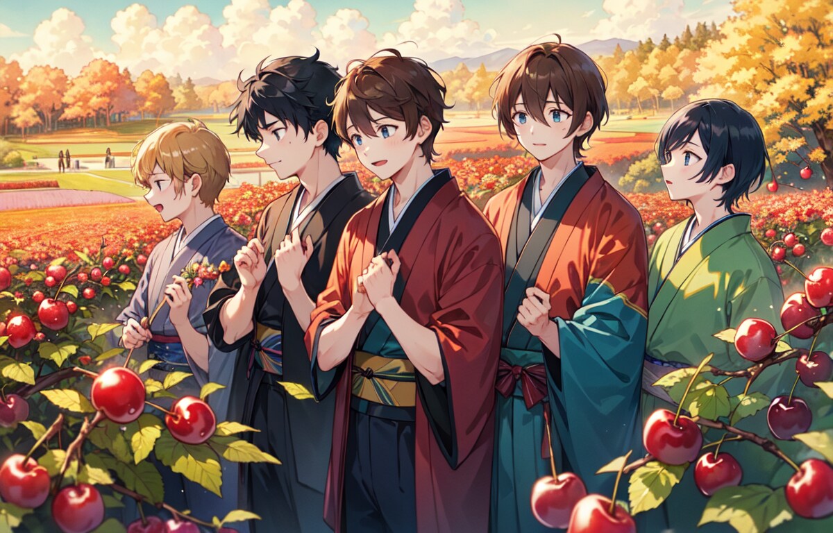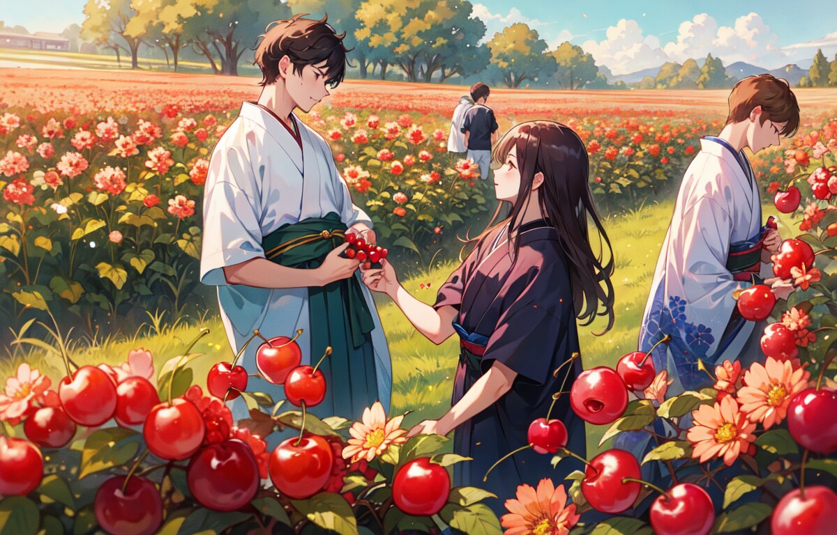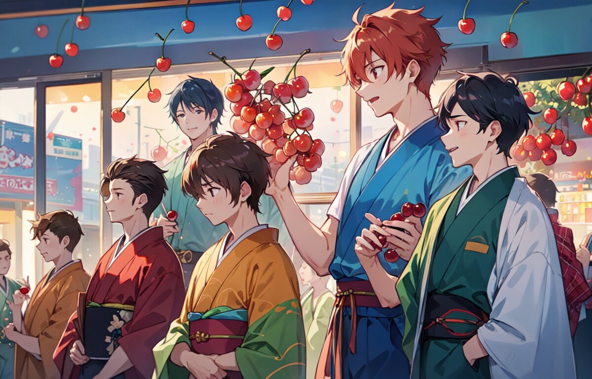 さくらんぼお題ということで、レトロモダン男子とも生成してみたい!!と思い、生成。楽しそうな男子や色合いが鮮やかなイラストがたくさん見れて楽しかったです。ただ、さくらんぼ狩りはなんだか違うような…。そこもAIイラストならではのダイナミックさという感じでお楽しみ下さいー。