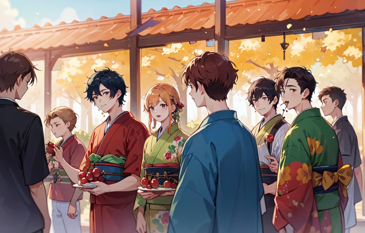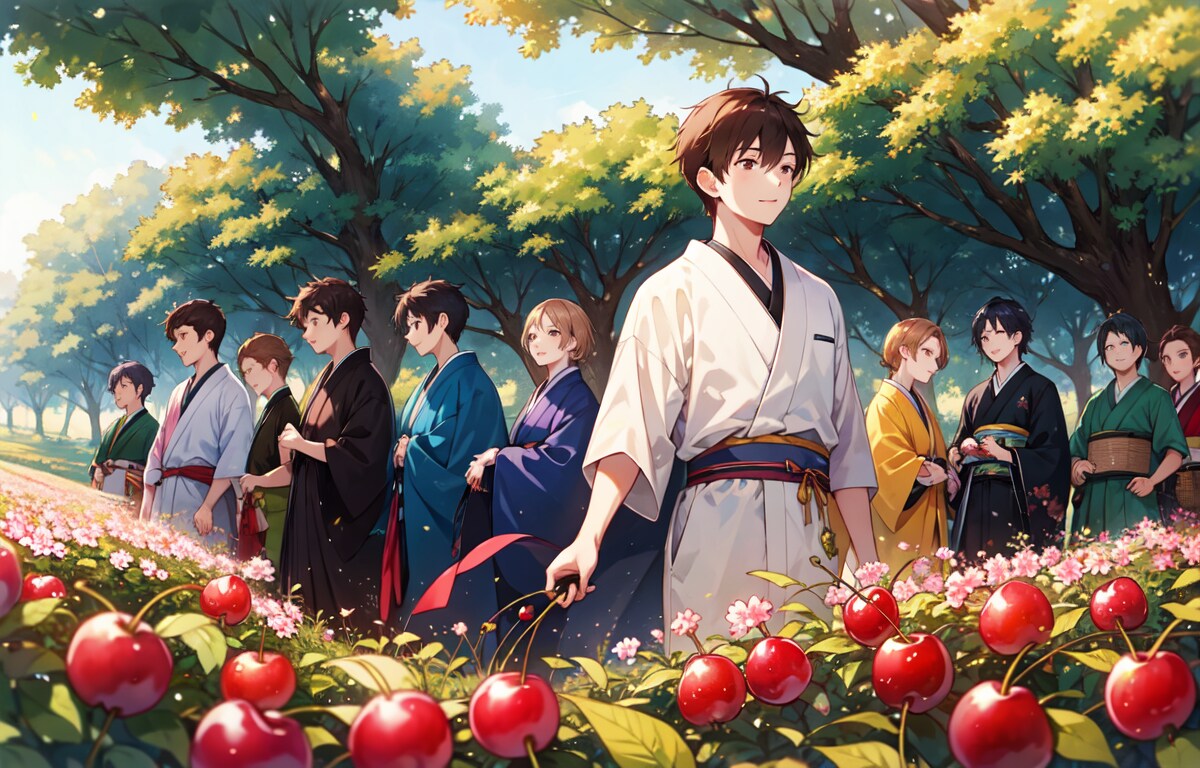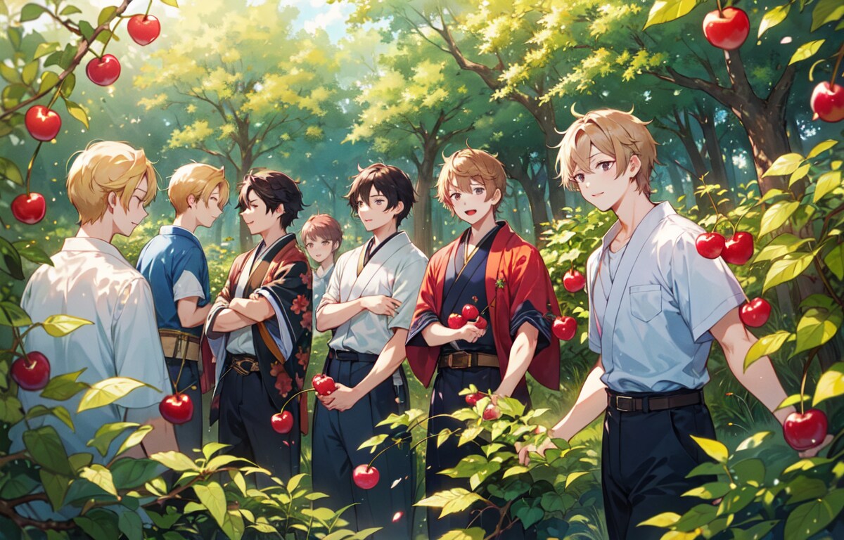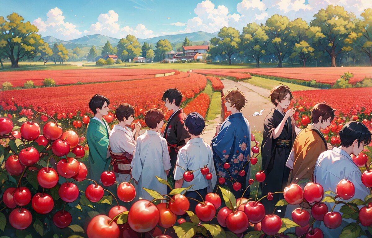 さくらんぼお題ということで、レトロモダン男子とも生成してみたい!!と思い、生成。楽しそうな男子や色合いが鮮やかなイラストがたくさん見れて楽しかったです。ただ、さくらんぼ狩りはなんだか違うような…。そこもAIイラストならではのダイナミックさという感じでお楽しみ下さいー。
