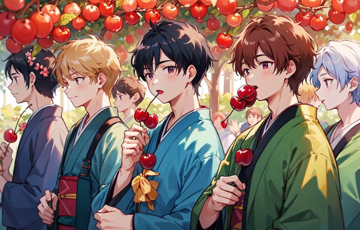 では、さくらんぼを楽しむレトロモダンな男子達をご覧ください!!