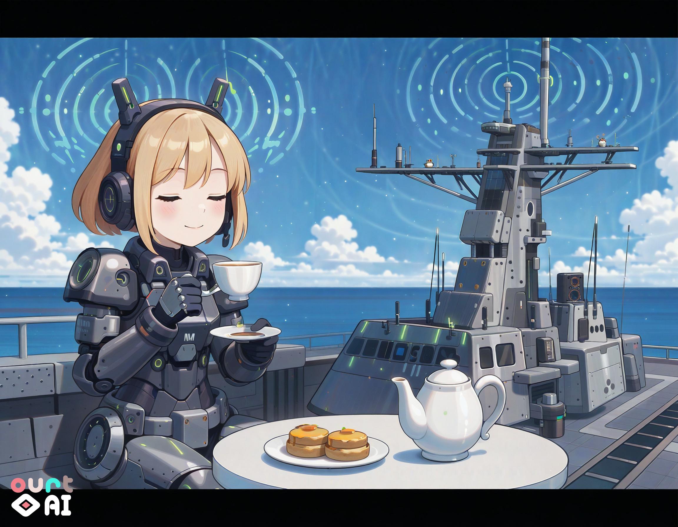 横長のアニメイラスト。機械鎧の女の子が巨大ハイテクボートの上でティータイムを楽しんでいる。機械鎧と巨大ハイテクボートのアンテナから同じ電波が出ている。