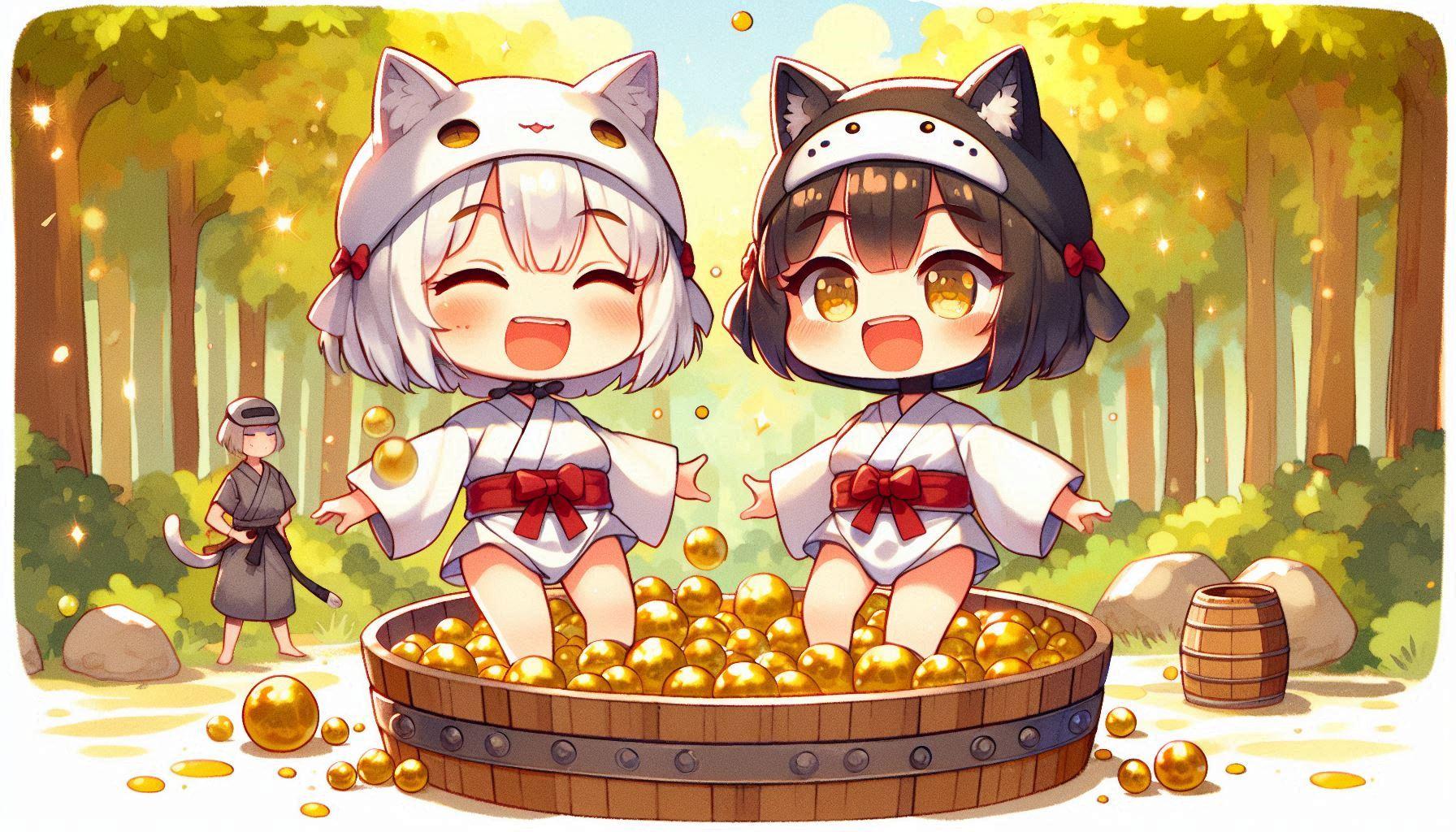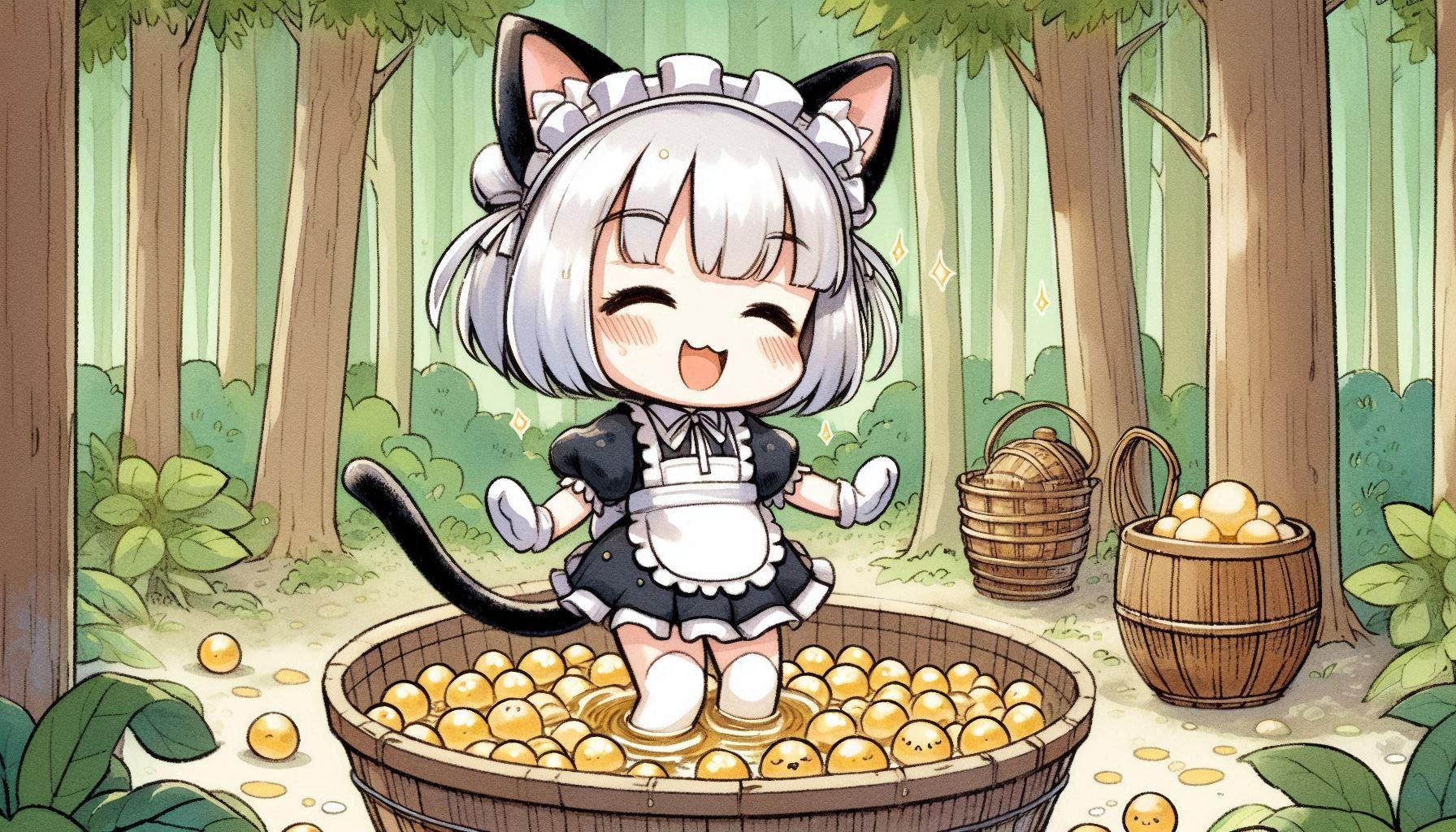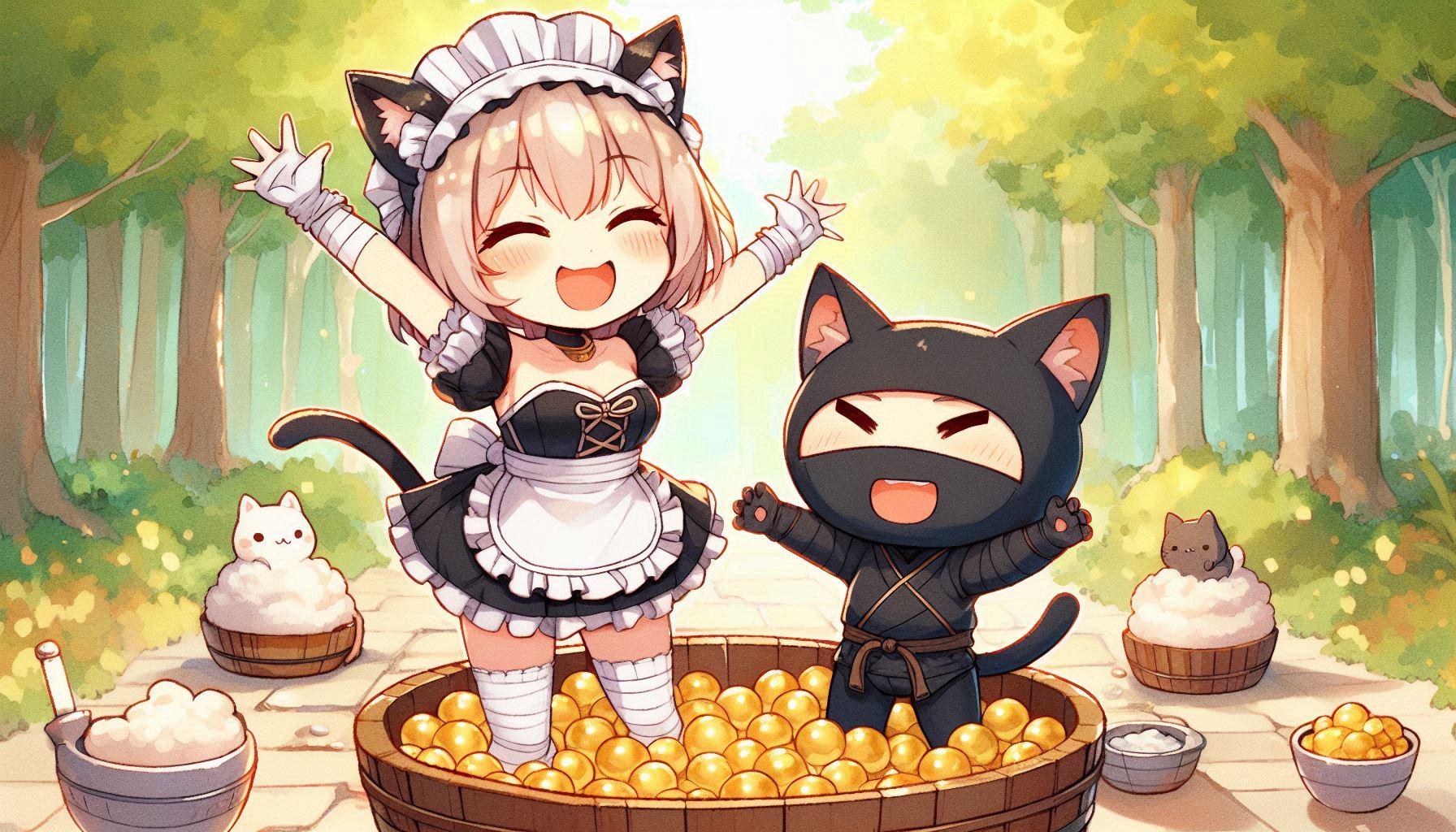 というリクエストが魔王城方面からあったため、ねこメイド忍者組は、キンタマをたらいにいれて踏んづけています