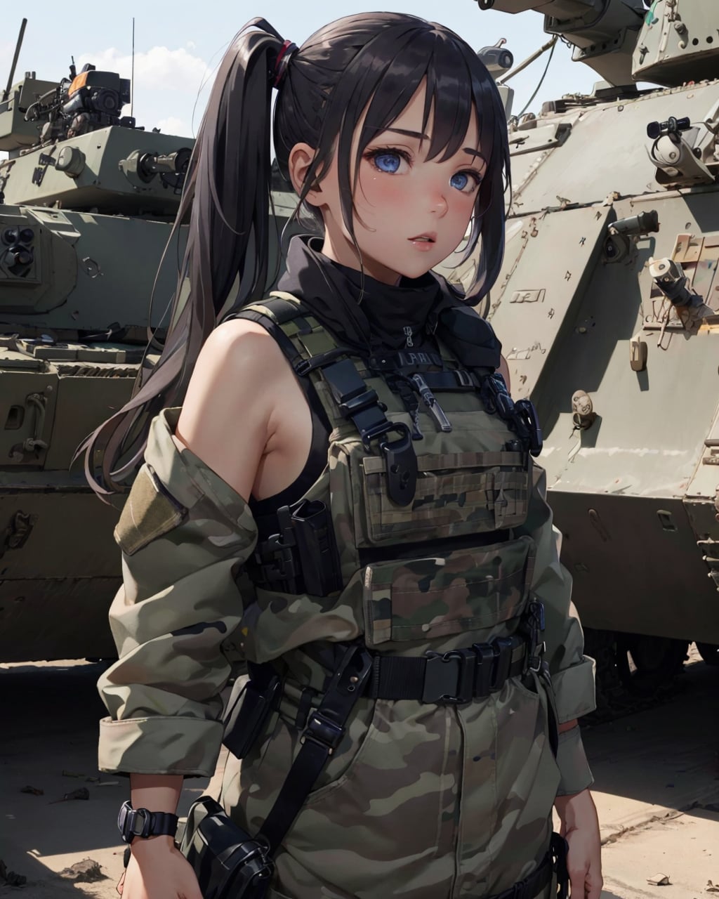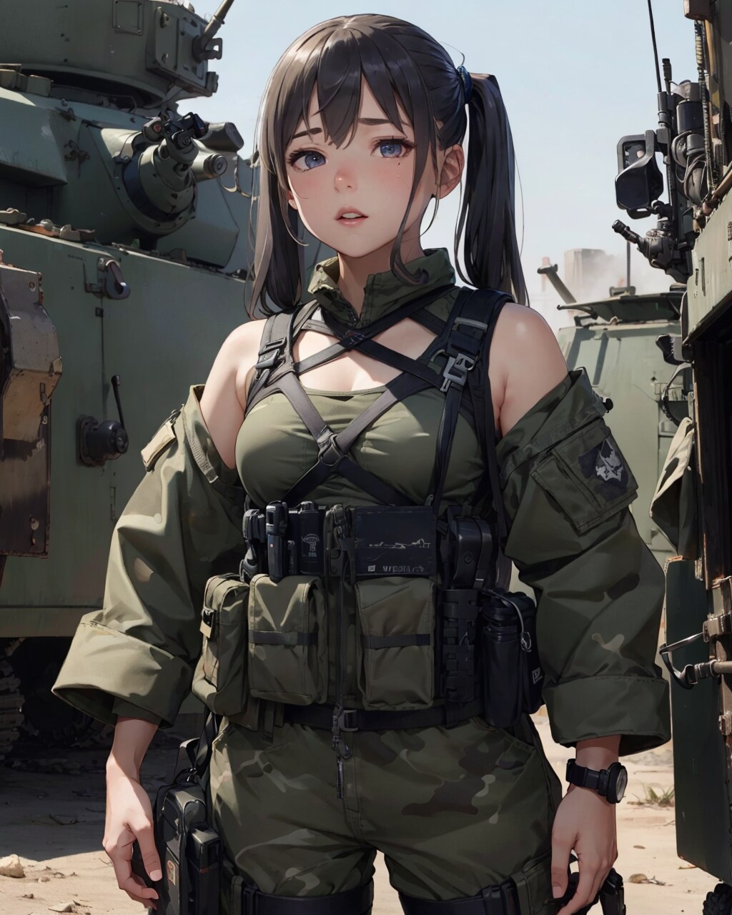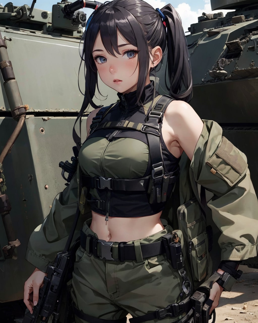 1女, チェストハーネス, ミリタリージャケット, オープンコート, アサルトライフル, ベルト, タンクトップ, ボディハーネス, デニム, 軍用車, 戦場記者