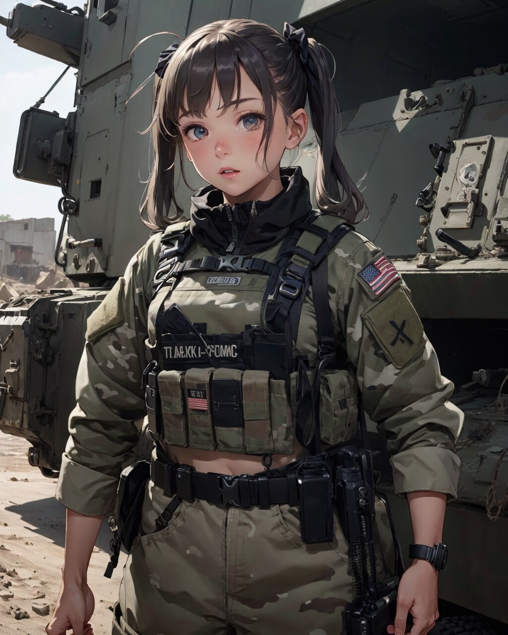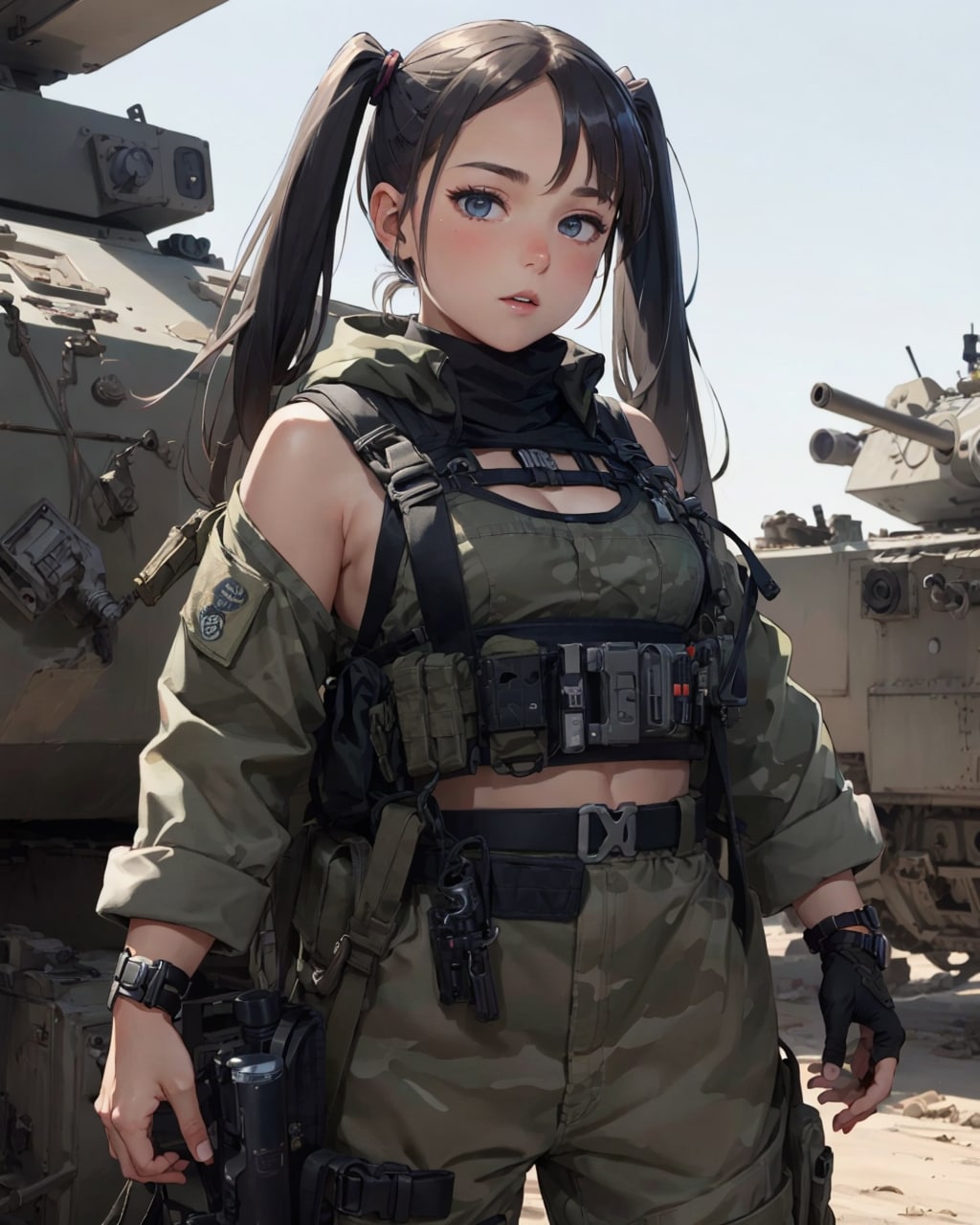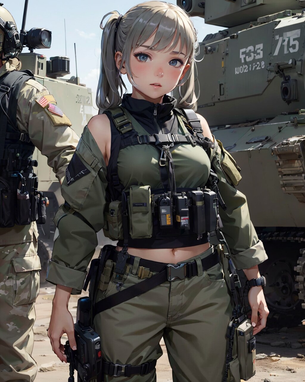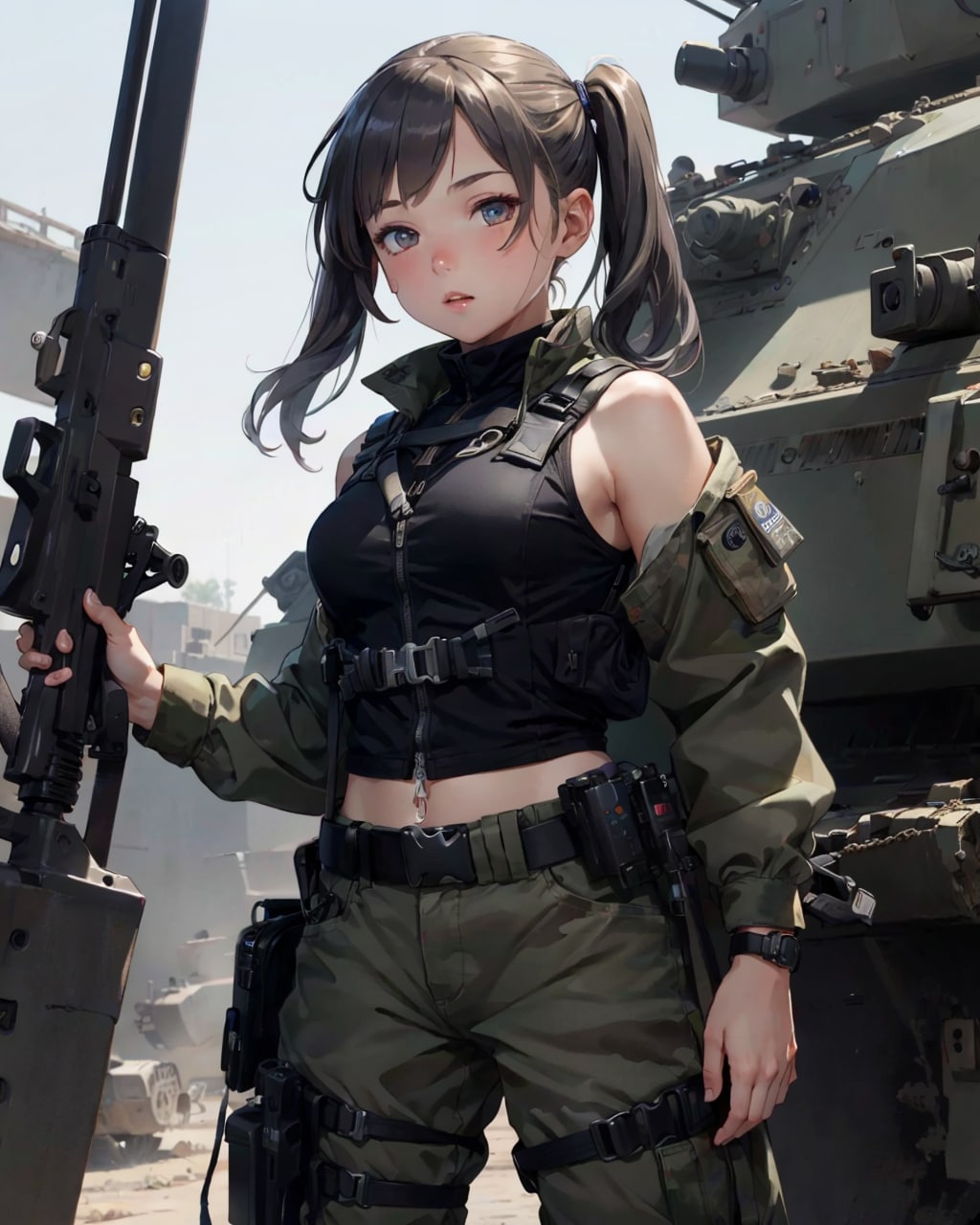 1女, チェストハーネス, ミリタリージャケット, オープンコート, アサルトライフル, ベルト, タンクトップ, ボディハーネス, デニム, 軍用車, 戦場記者