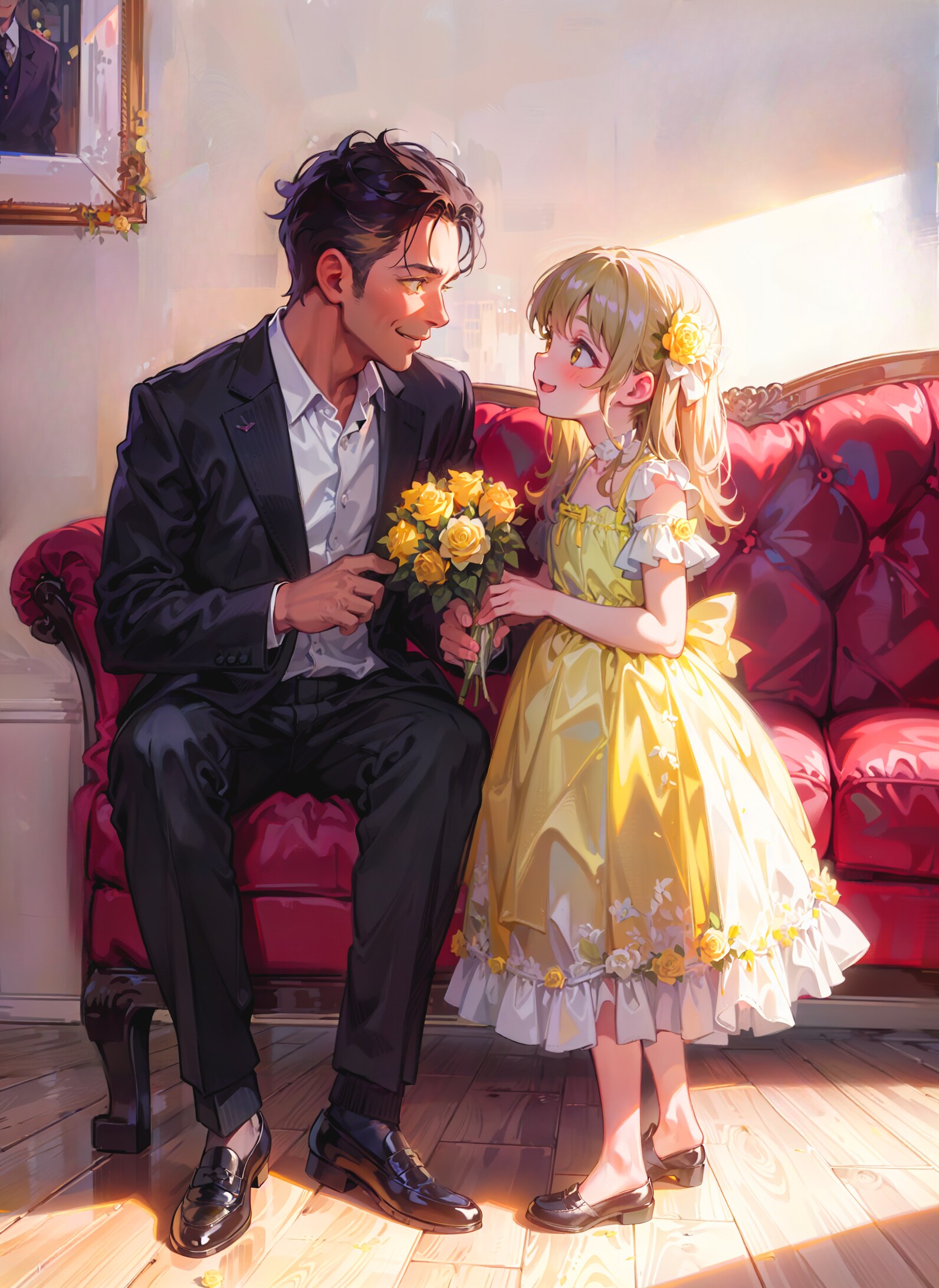 お父さんに黄色いバラを贈る女の子を作ってみました。
