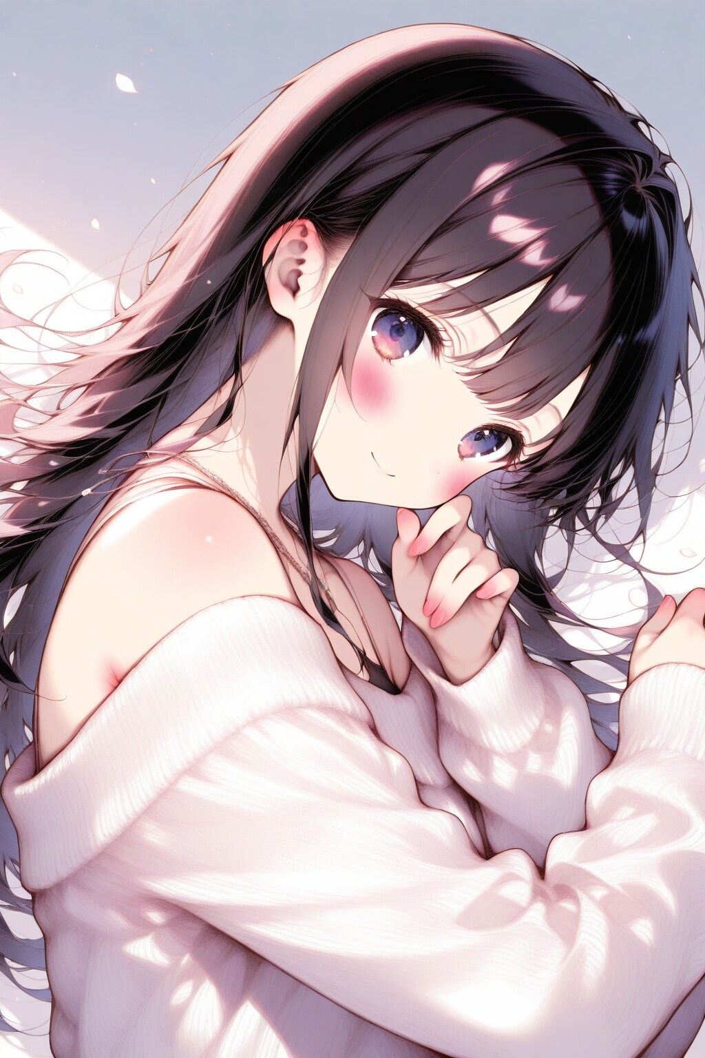 longhair seductive elegant honey lady, lying sofa, white winter wear, hand head edge, embarrassed, laugh,