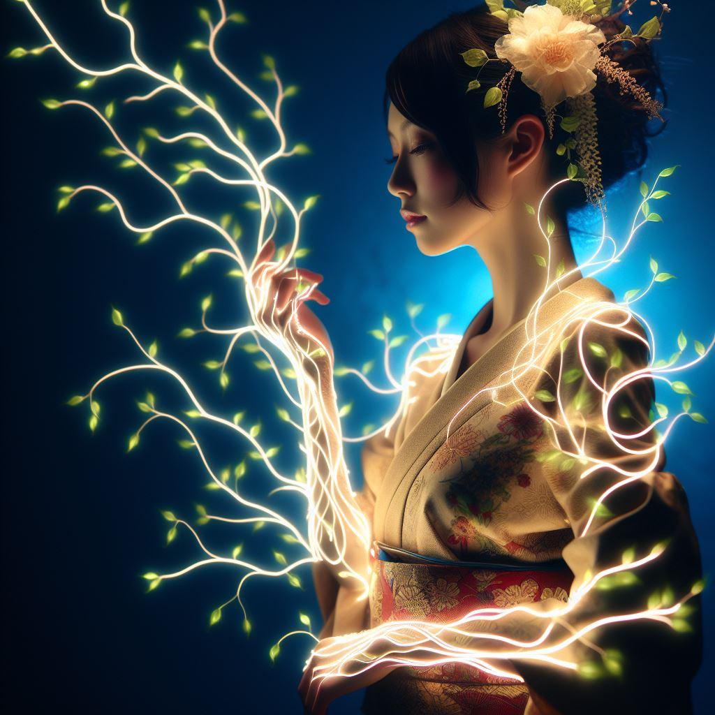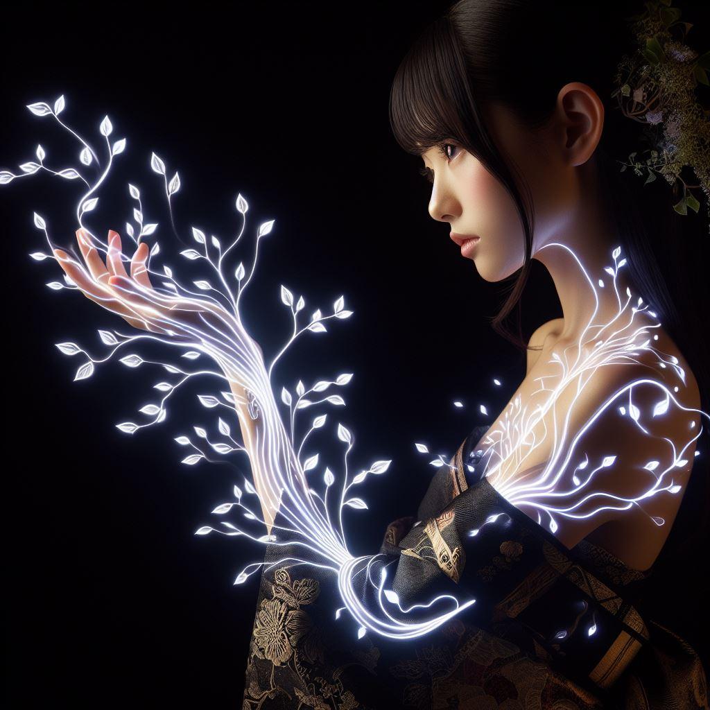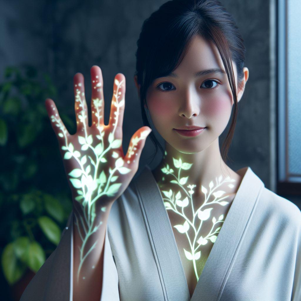 彼女は家を飛び出し、町の中心にある広場へと向かった。そこには倒れた木々や瓦礫が散乱していた。彼女は深呼吸をし、両手を前に差し出した。すると、彼女の腕に緑色の光が浮かび上がり、皮膚にツタの模様が現れた。その瞬間、彼女の手から実際のツタが伸び始め、瓦礫を持ち上げたり、倒れた木々を押しのけたりし始めた。