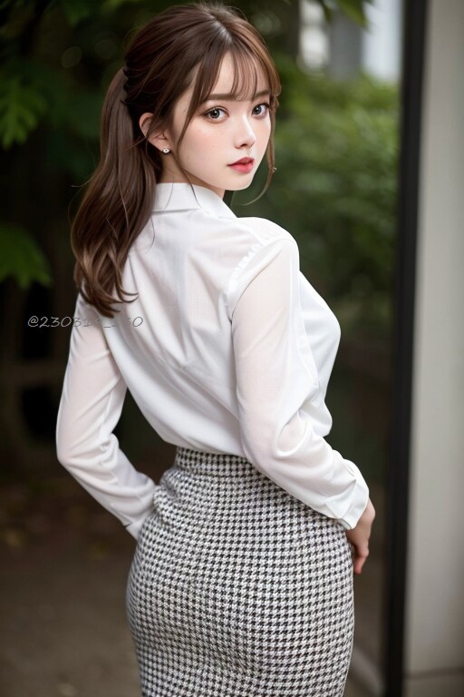 比較しやすいように、上は白シャツ(透けブラローラ)、下はタイトスカート(pencil skirt)(パンティラインローラ)で統一しています。