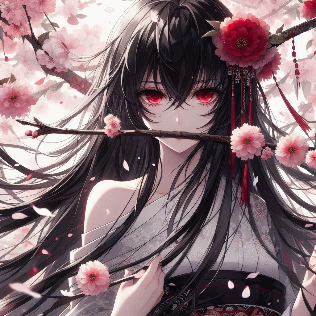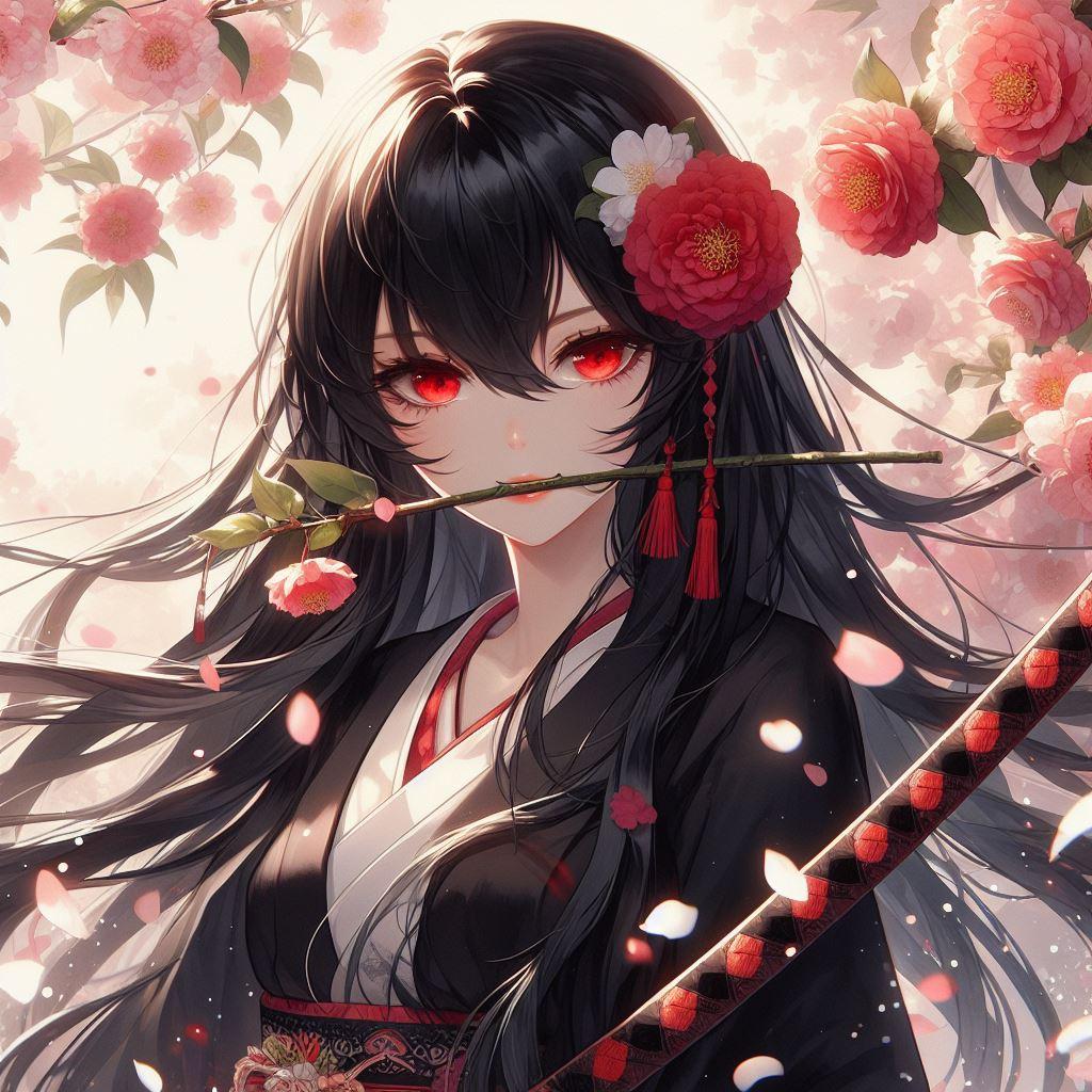 桜の枝を咥える黒髪の女侍さん