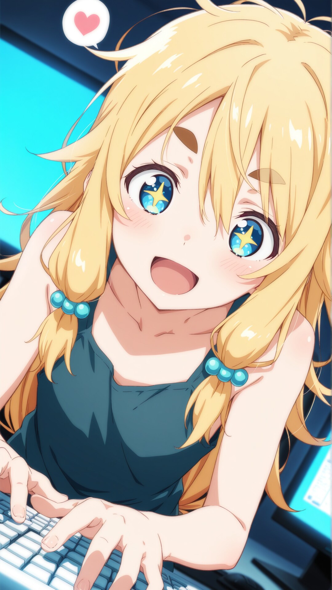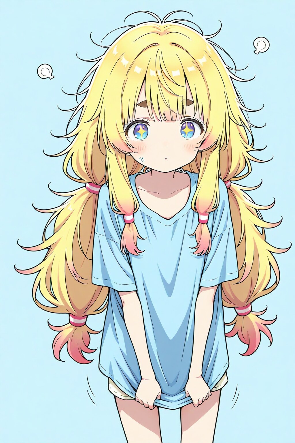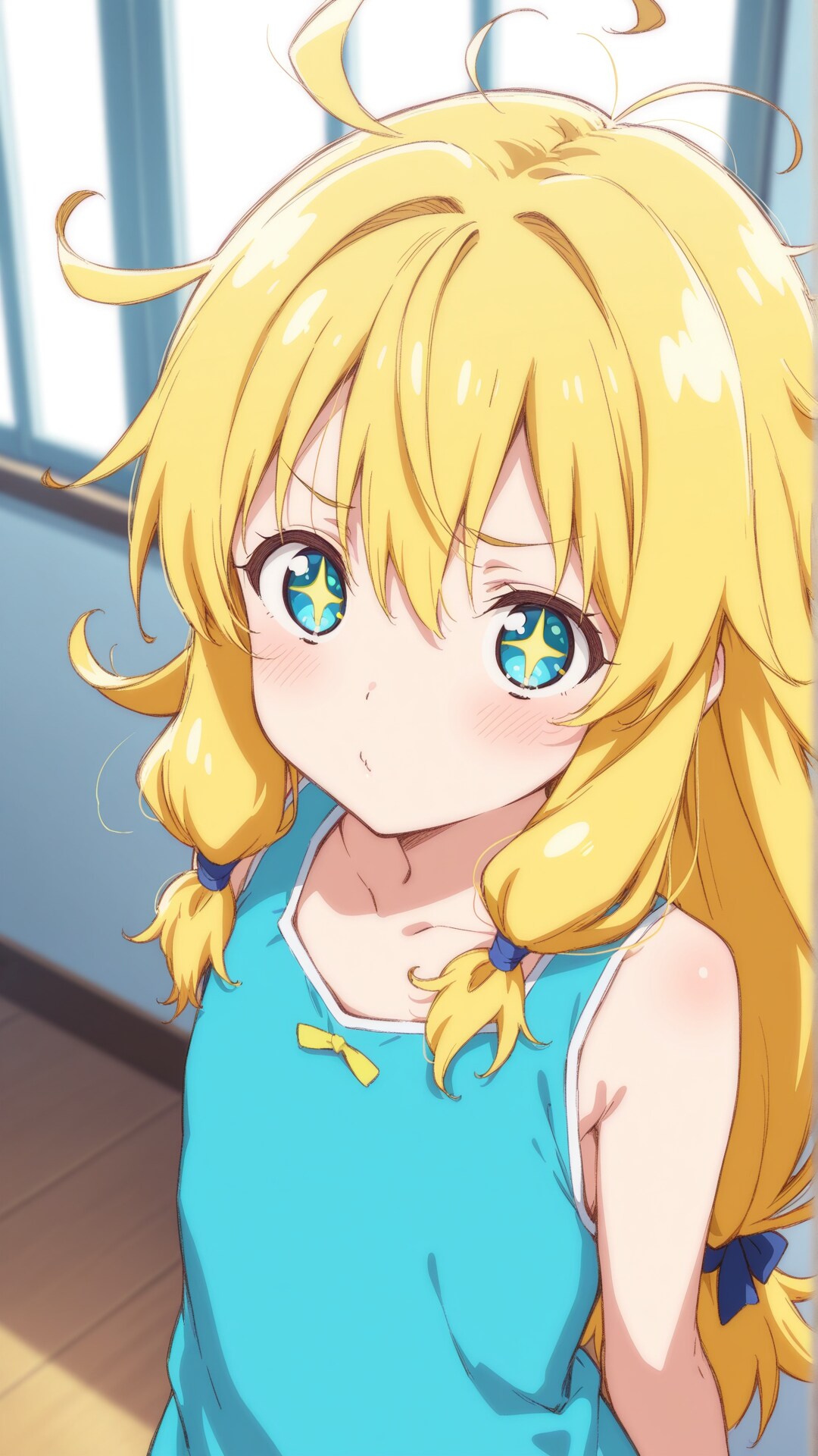 1girl, blue eyes, +_+, blonde hair, messy hair, low-tied sidelocks, flat chest, skinny, thick eyebrows, blue shirt,