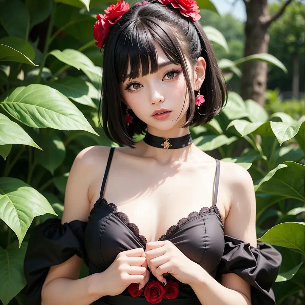 緑豊かな葉陰で、赤い薔薇をあしらったアクセサリーが映える若い女性。彼女の黒髪は短く、端正な顔立ちに寄り添い、その目は語りかけるような深みを持っています。自然の中での彼女の優雅な姿勢は、周囲の生命力をさらに際立たせています。