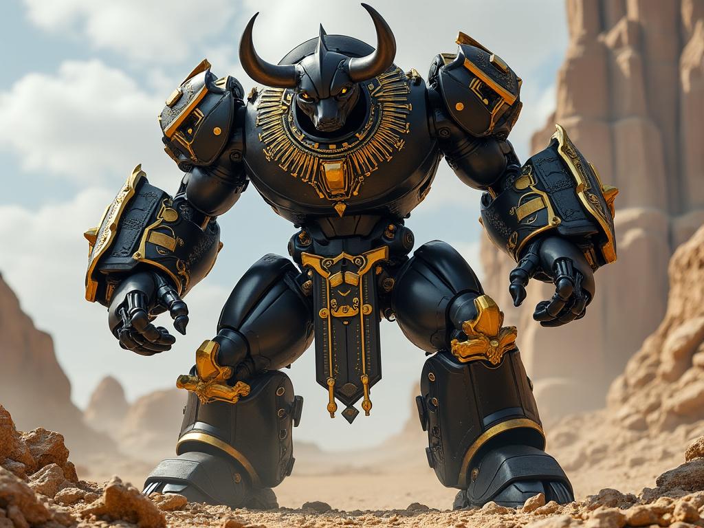 砂漠で鍛え上げられた、この無敵のタイタンが立ちはだかる。 黄金と黒曜石が輝く鎧、突進するかのような雄牛の角を備えたこの巨大戦士は、どんな戦場でも支配者となるだろう。