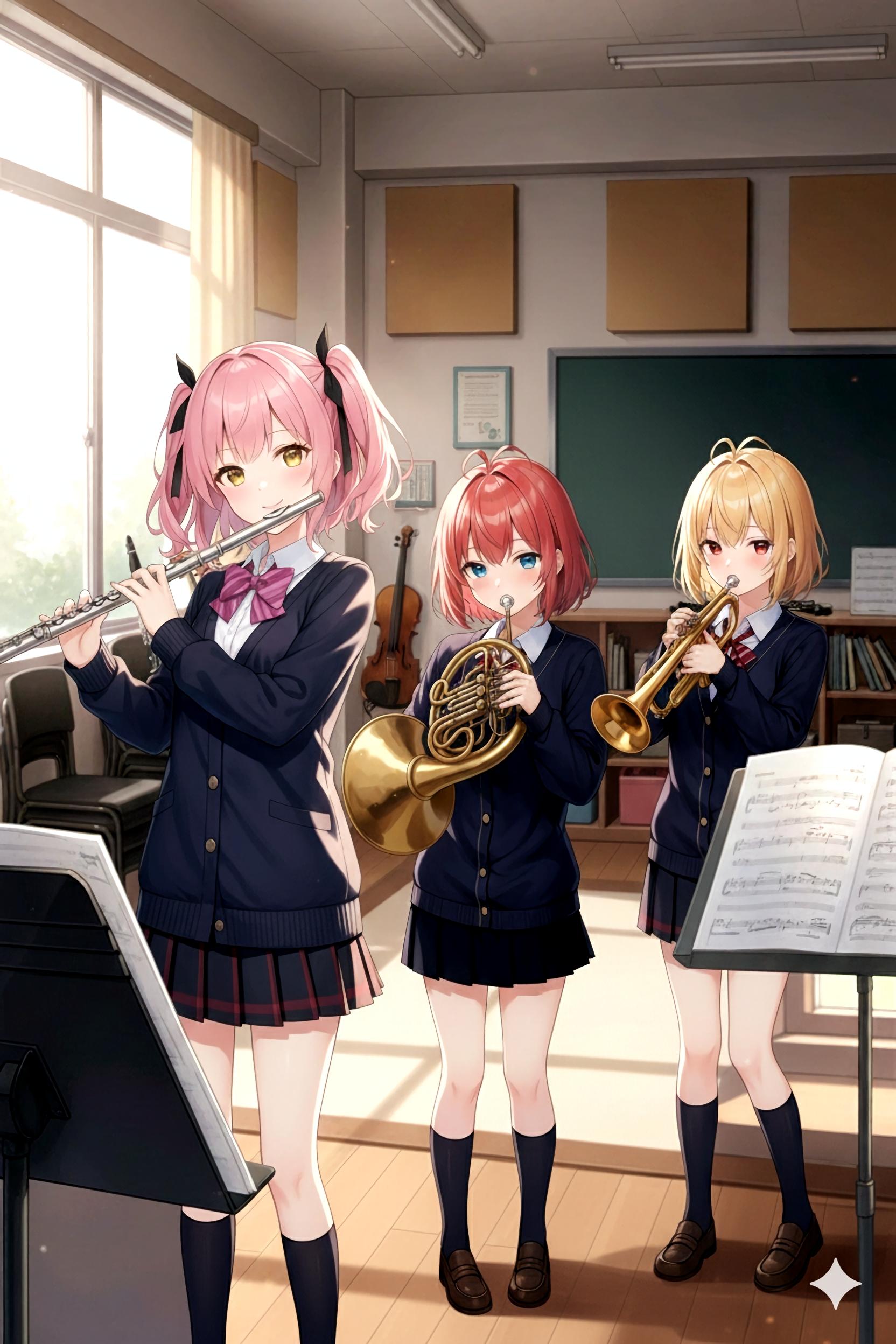 ナツミのトランペット、アキナのサックス、ハルネのフルート、カエデのホルン――