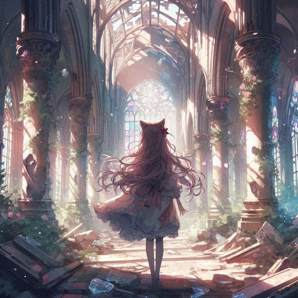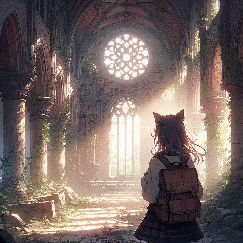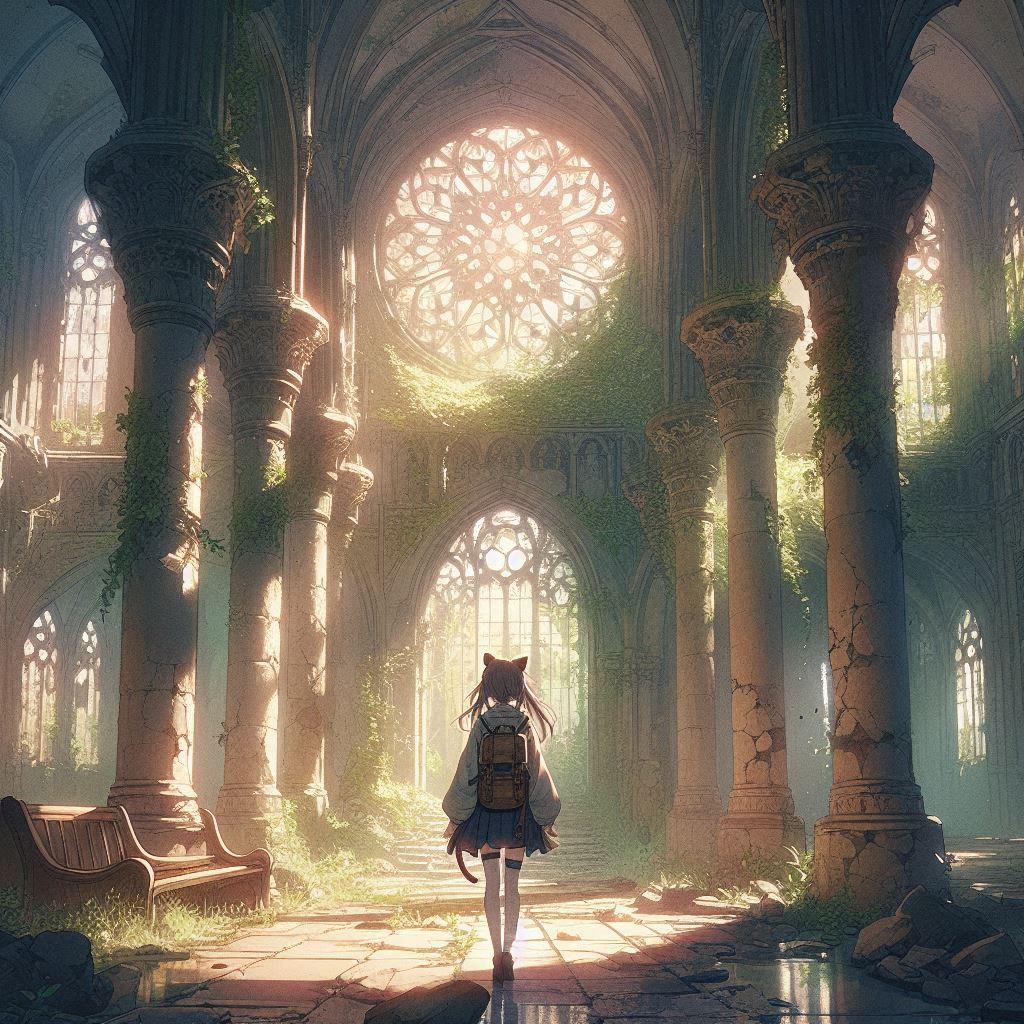 猫耳の獣人さんが廃墟を訪れた、というストーリーでイラストを生成してみました。