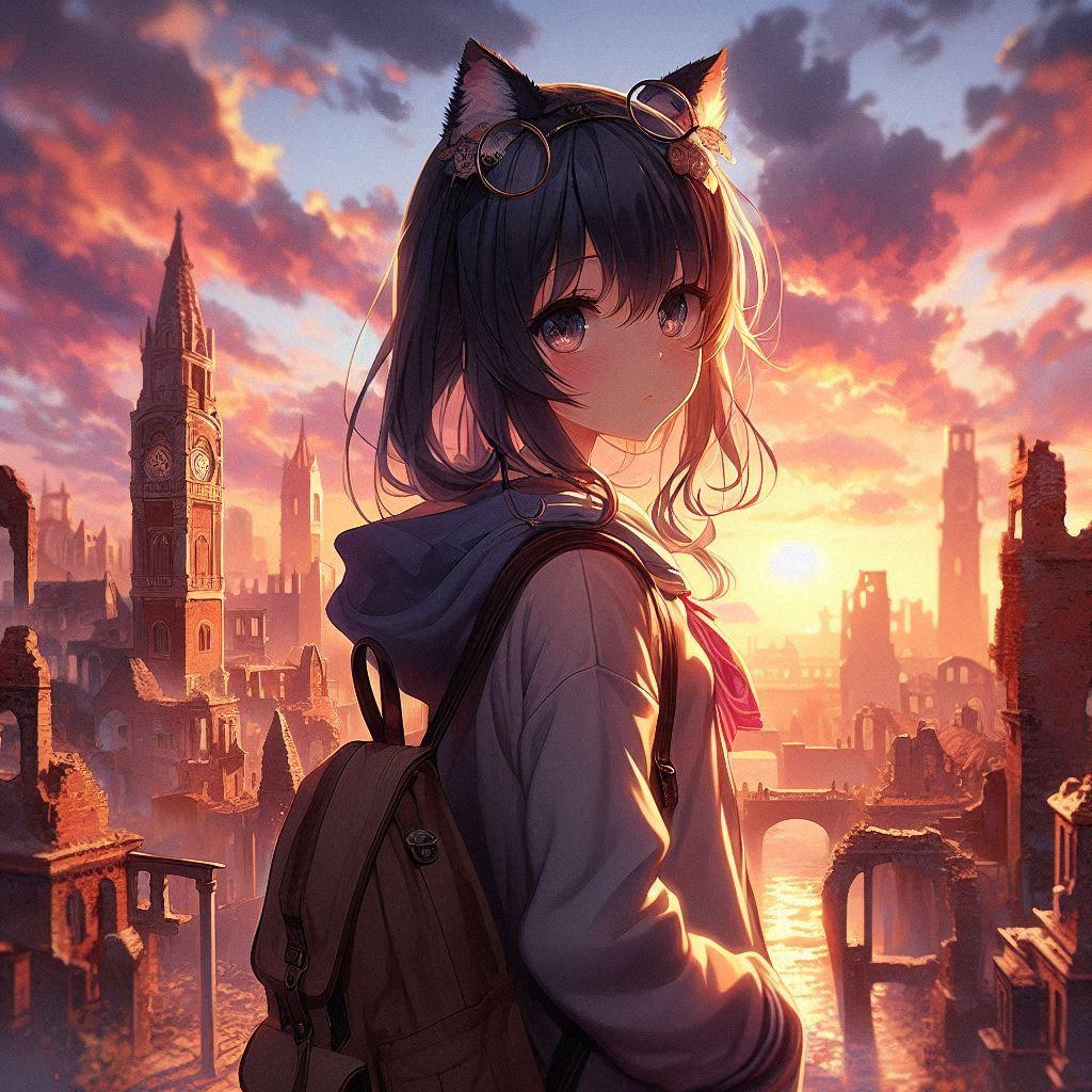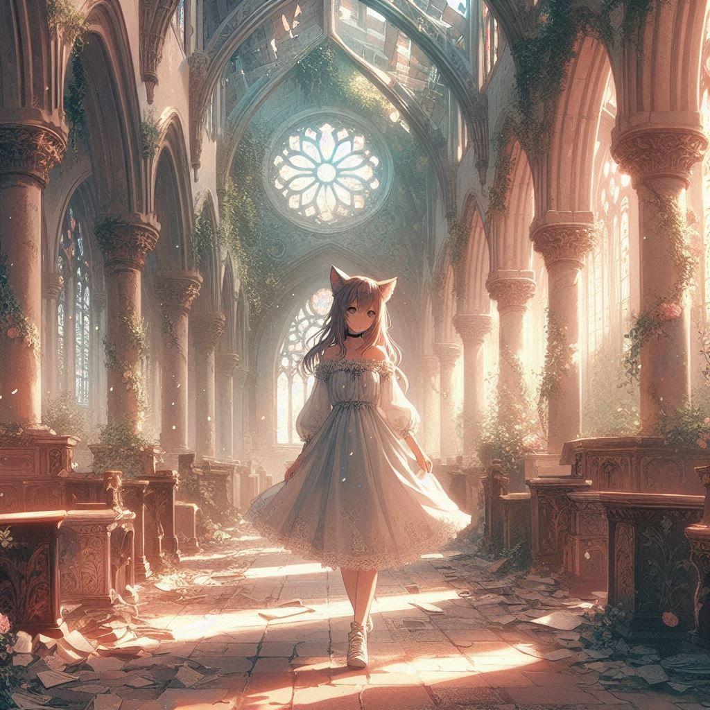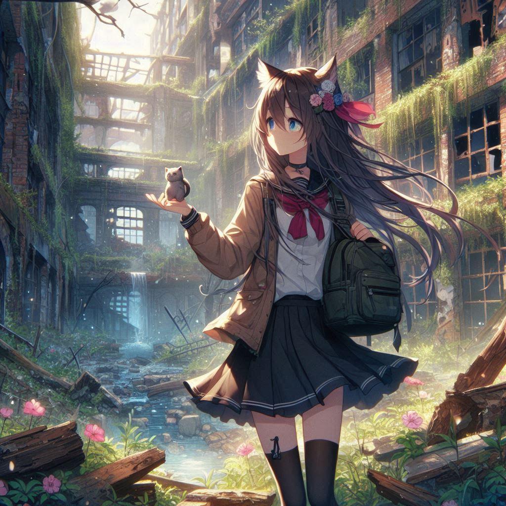 猫耳の獣人さんが廃墟を訪れた、というストーリーでイラストを生成してみました。