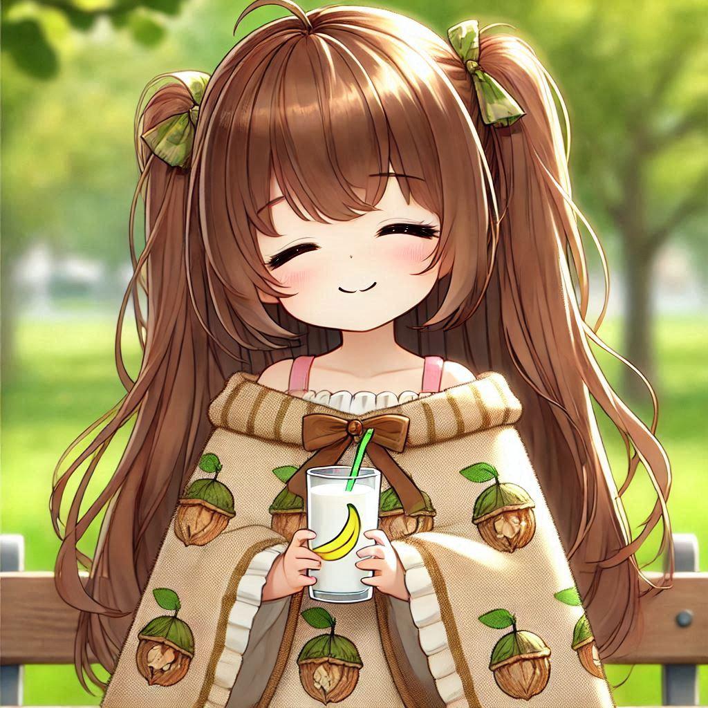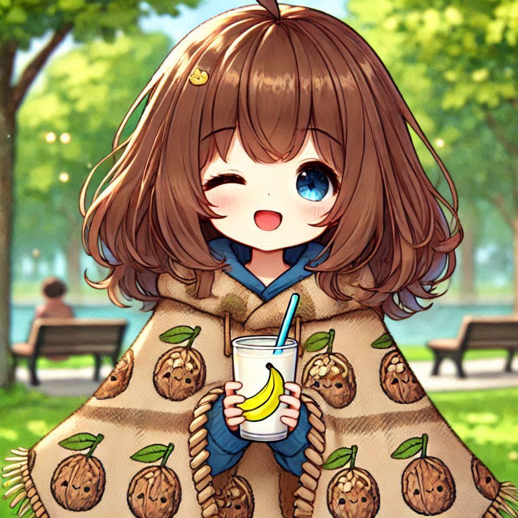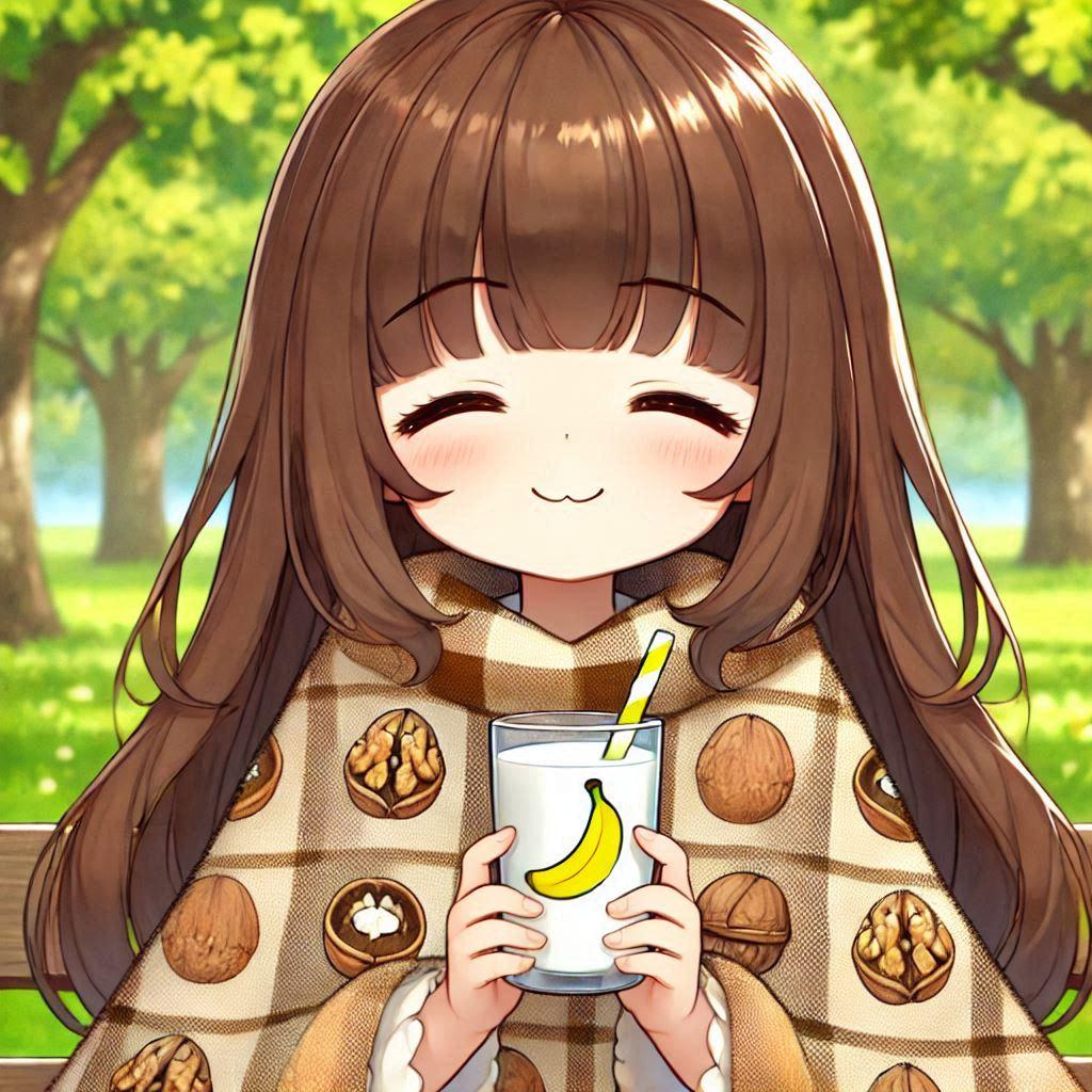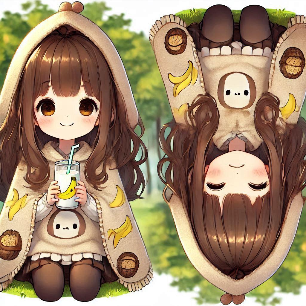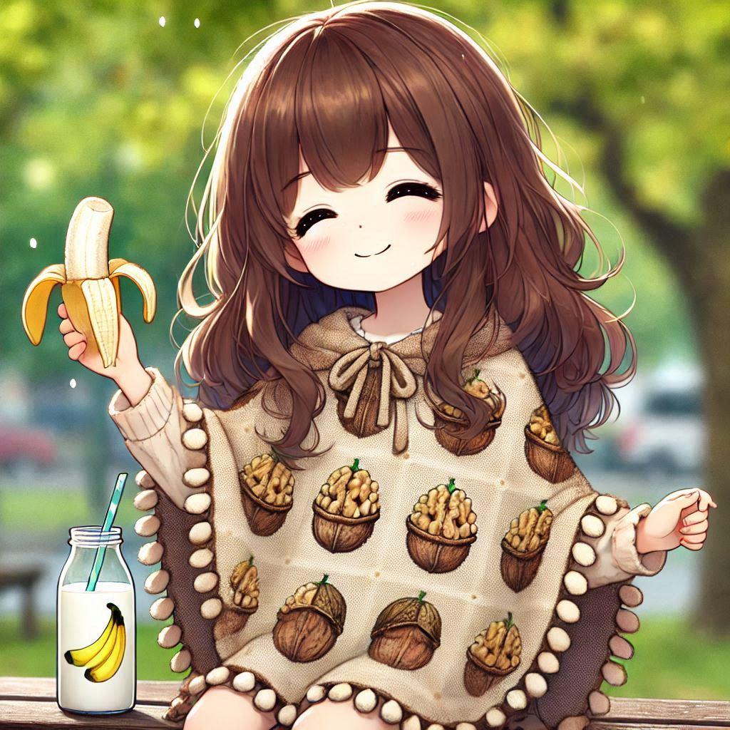 そんなクルミ柄のポンチョを着て、バナナ柄のコップでミルクを飲んでる他意はないイラスト