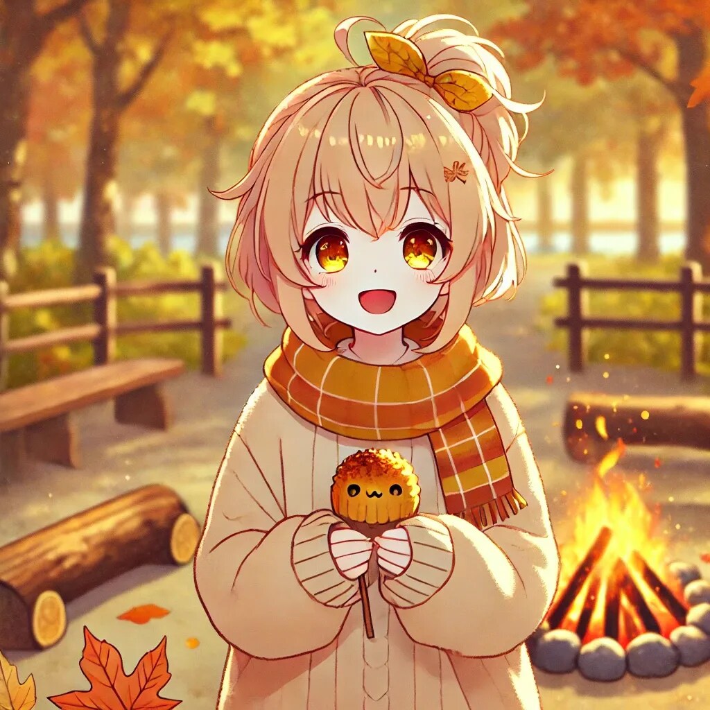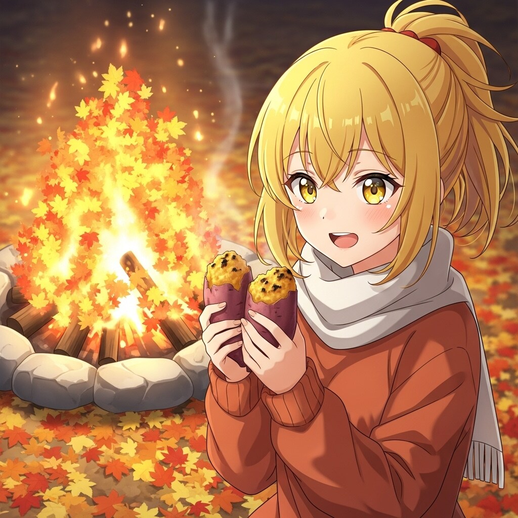 落ち葉のたき火と焼き芋という素朴な情景の中にも、彼女の“やさしい因子”がしっかり表現されていますね。