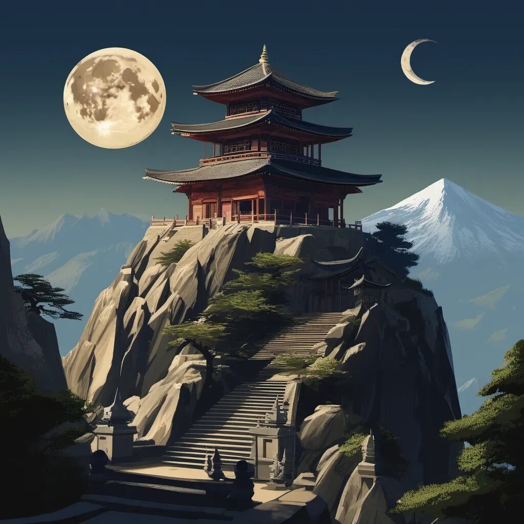 高い山々に囲まれた、月明かりに照らされた伝統的な寺院が描かれています。周囲は静けさに包まれ、寺院へ続く石段は神秘的な雰囲気を醸し出しており、訪れる者を時空を超えた旅へと誘います。雪を頂く山と、天空に浮かぶ大きな満月が、この光景に神々しい美しさを加えています。