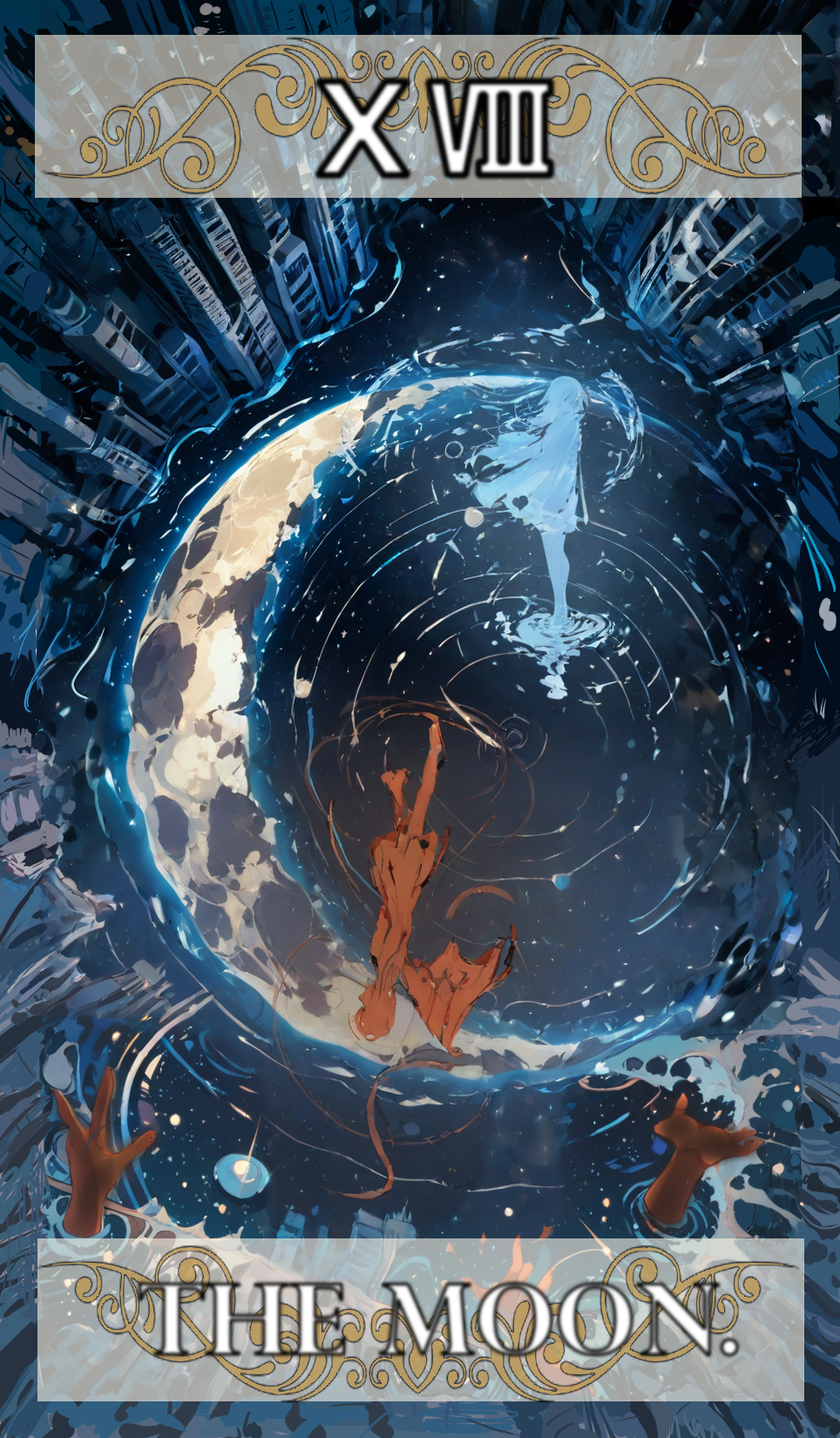タロットの18、月。伝統的な物では無く、不安定さや周期、反する振る舞いなどを入れて見ました。