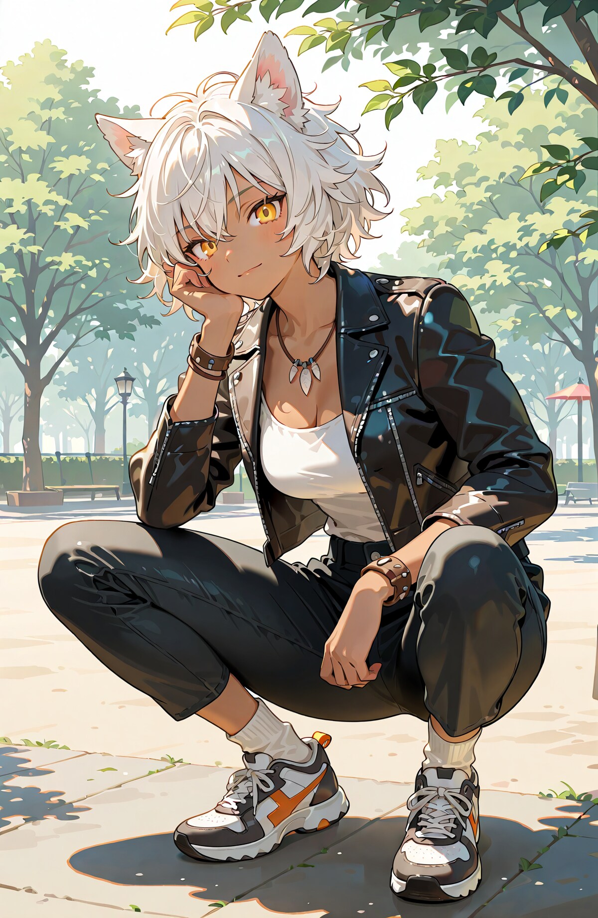 普段からスニーカーを履いてそうな人物...ということでワーウルフの武術家アウローラさんが、そろそろ暖かくなってきた公園にやってきた...というシチュで創りました。
