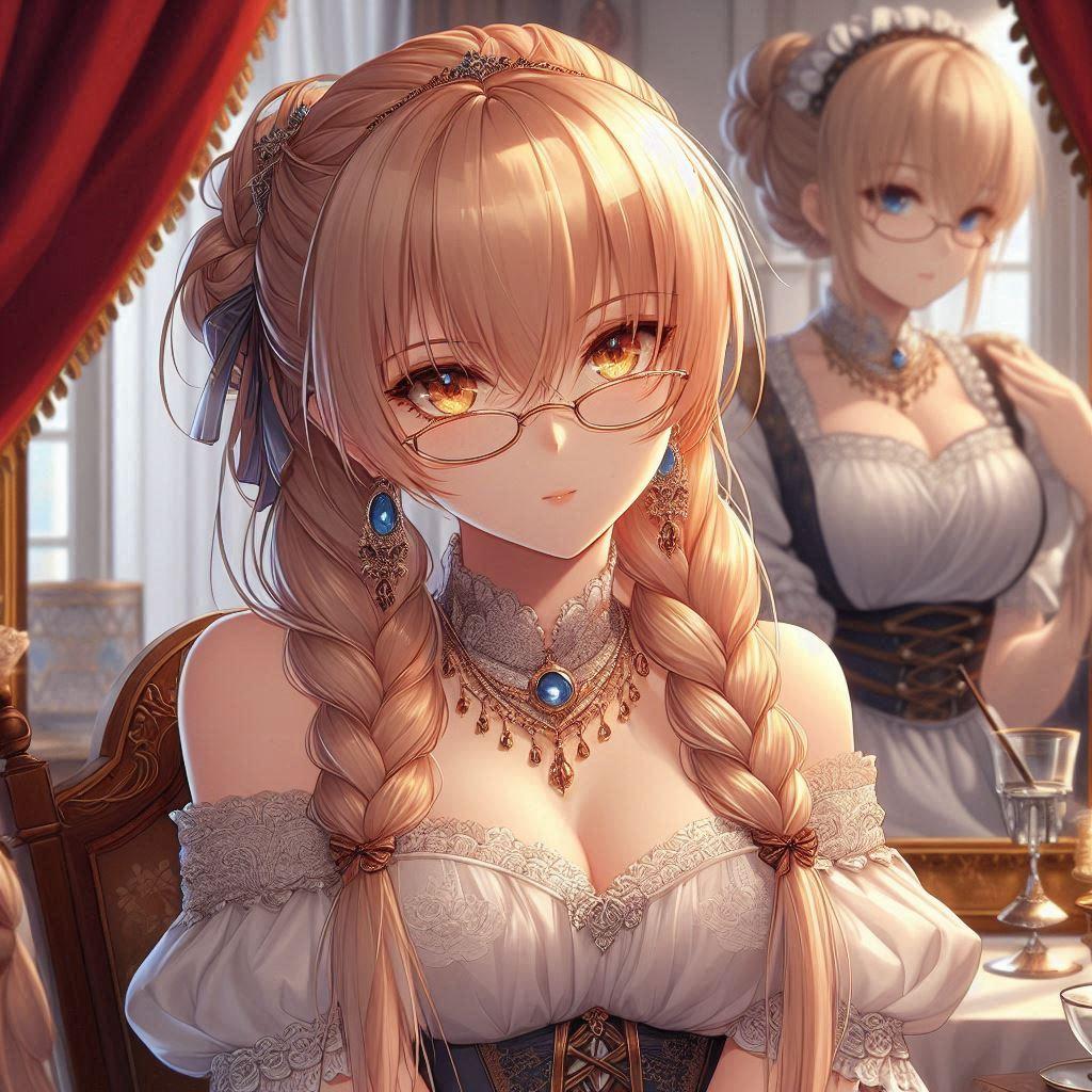 ということで、いつものヘアスタイルを三つ編みに変えて眼鏡を装着してみたエリザベス。ついでに衣装もいつもの鎧姿ではなく、ドレス姿に(´∀`)