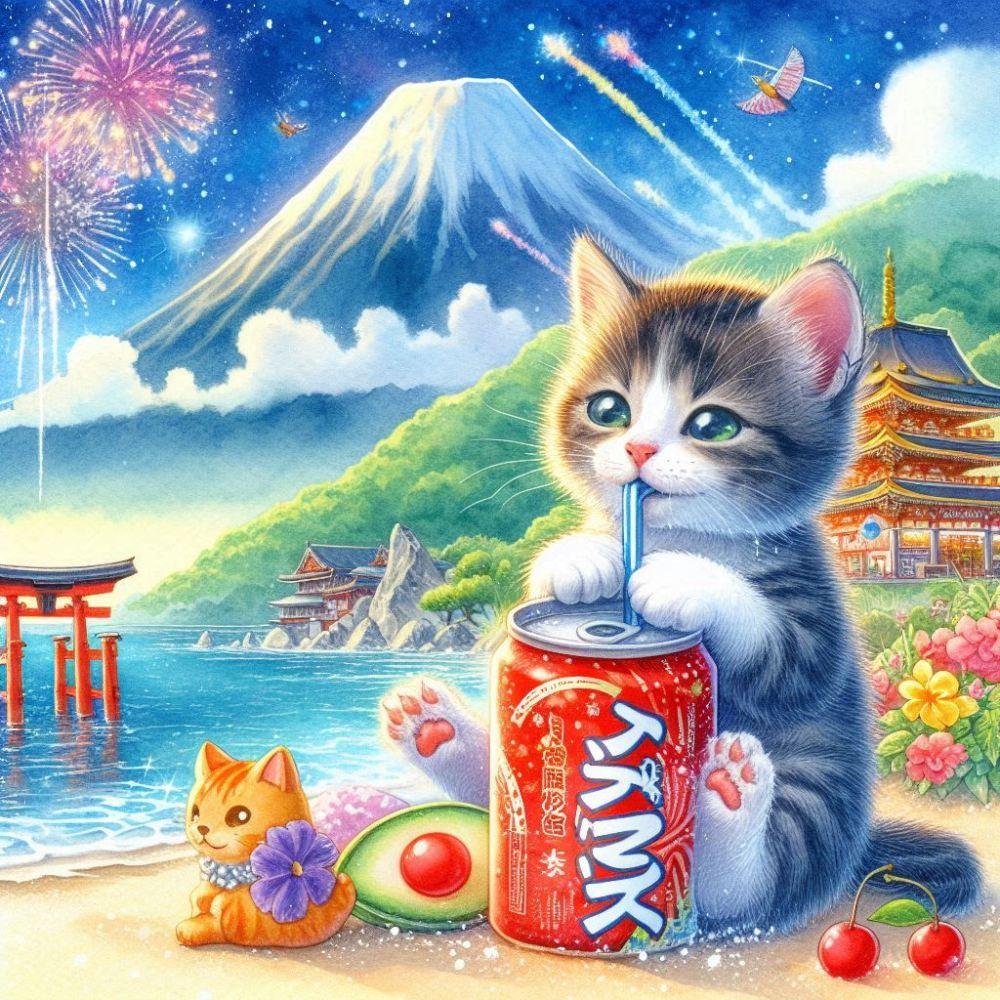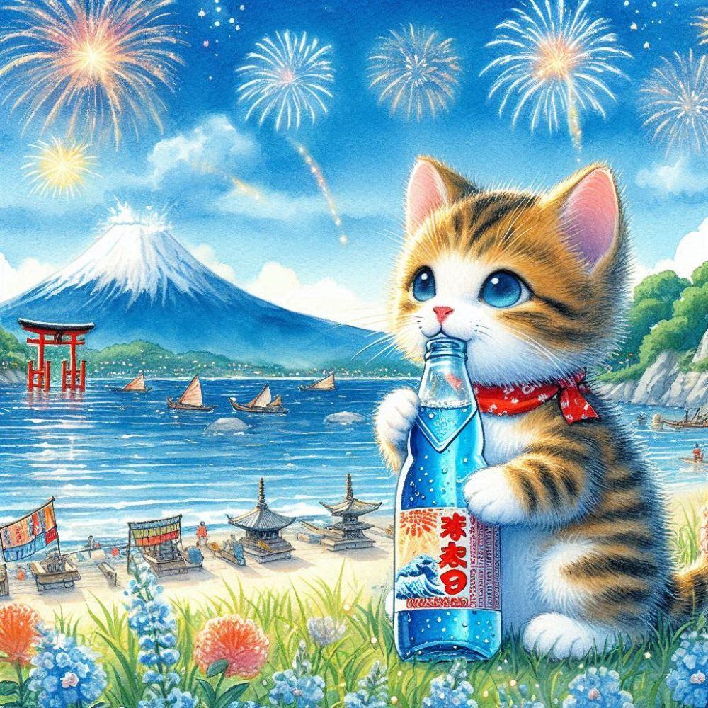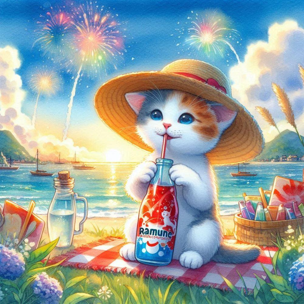 水彩風 キンキンに冷えたラムネを飲む子猫