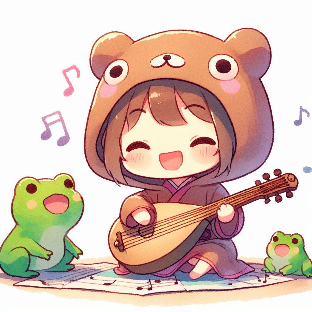うちのたぬちゃん(たぬき娘)がカエルたちと楽しく琵琶をひいています