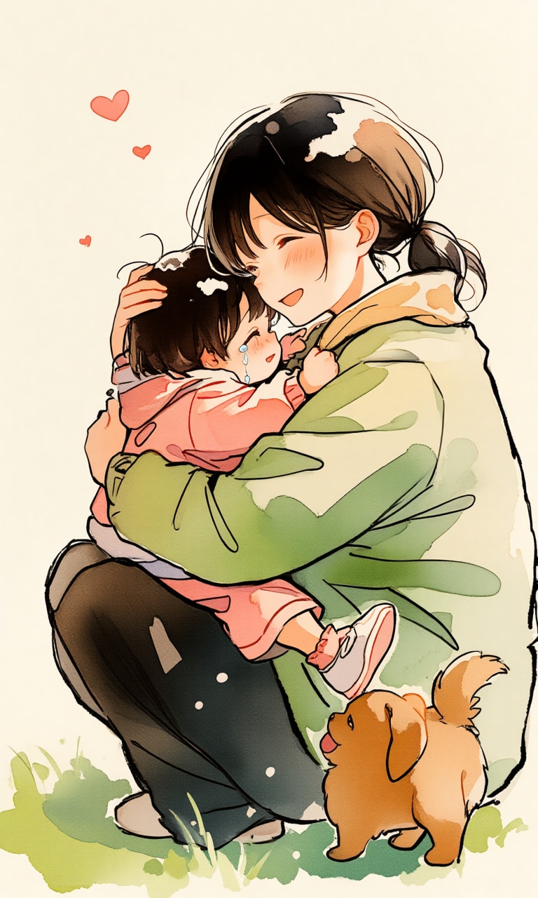 子犬に驚いて泣く子