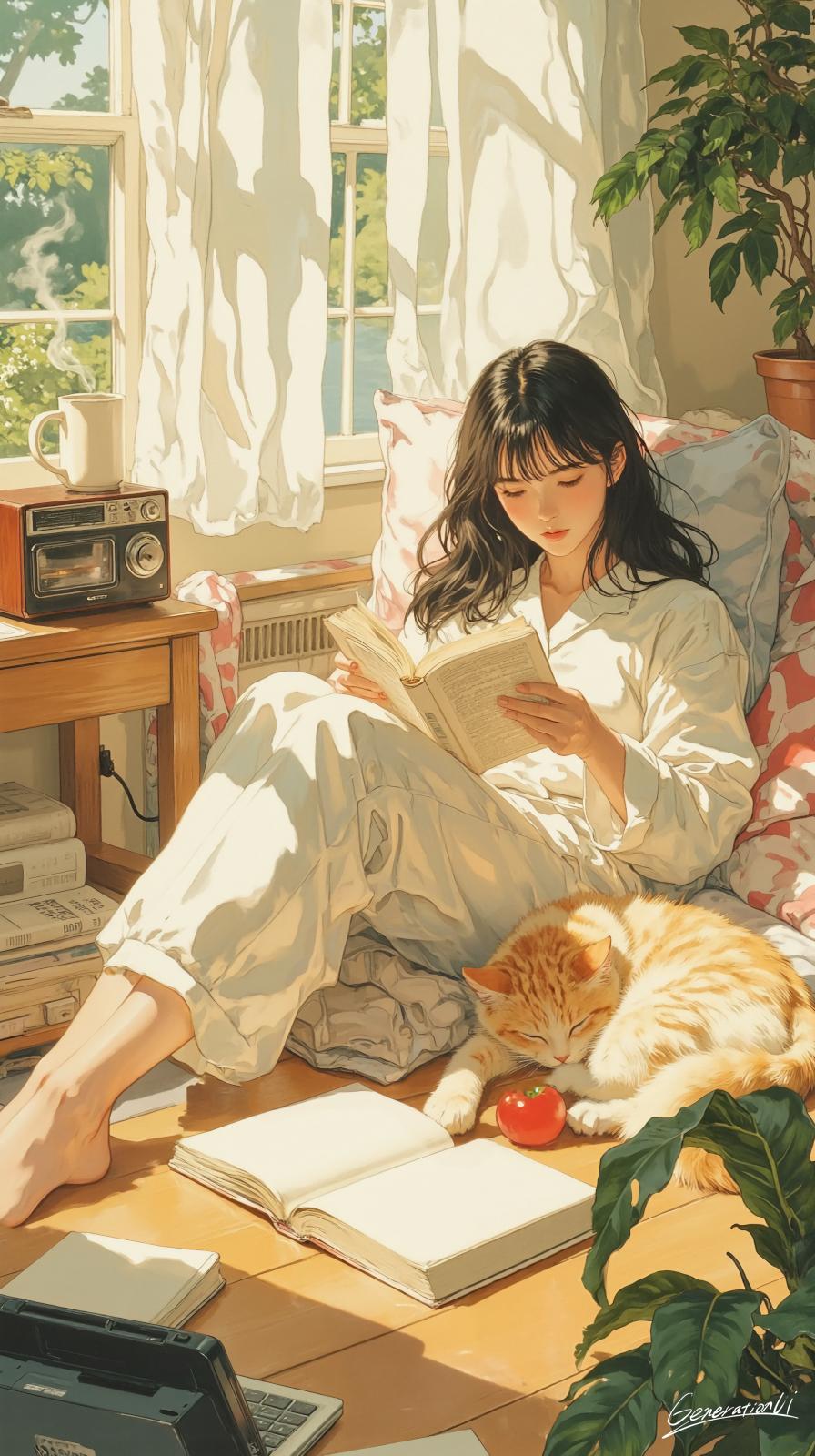 お気に入りの本を開くと、すぐそばでミルクが足にからまるようにして丸くなる。