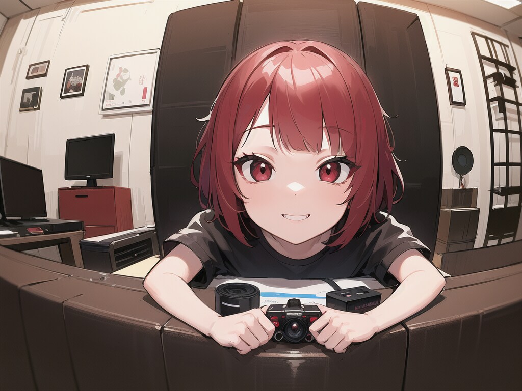 (masterpiece, best quality, ultra detailed)++,a desk in a messy room filled with gaming equipment, streaming gear,furniture, with a setup for streaming, surrounded by various gaming devices and other tech,Include details such as the room's vibrant,(fisheye lens)++,creative