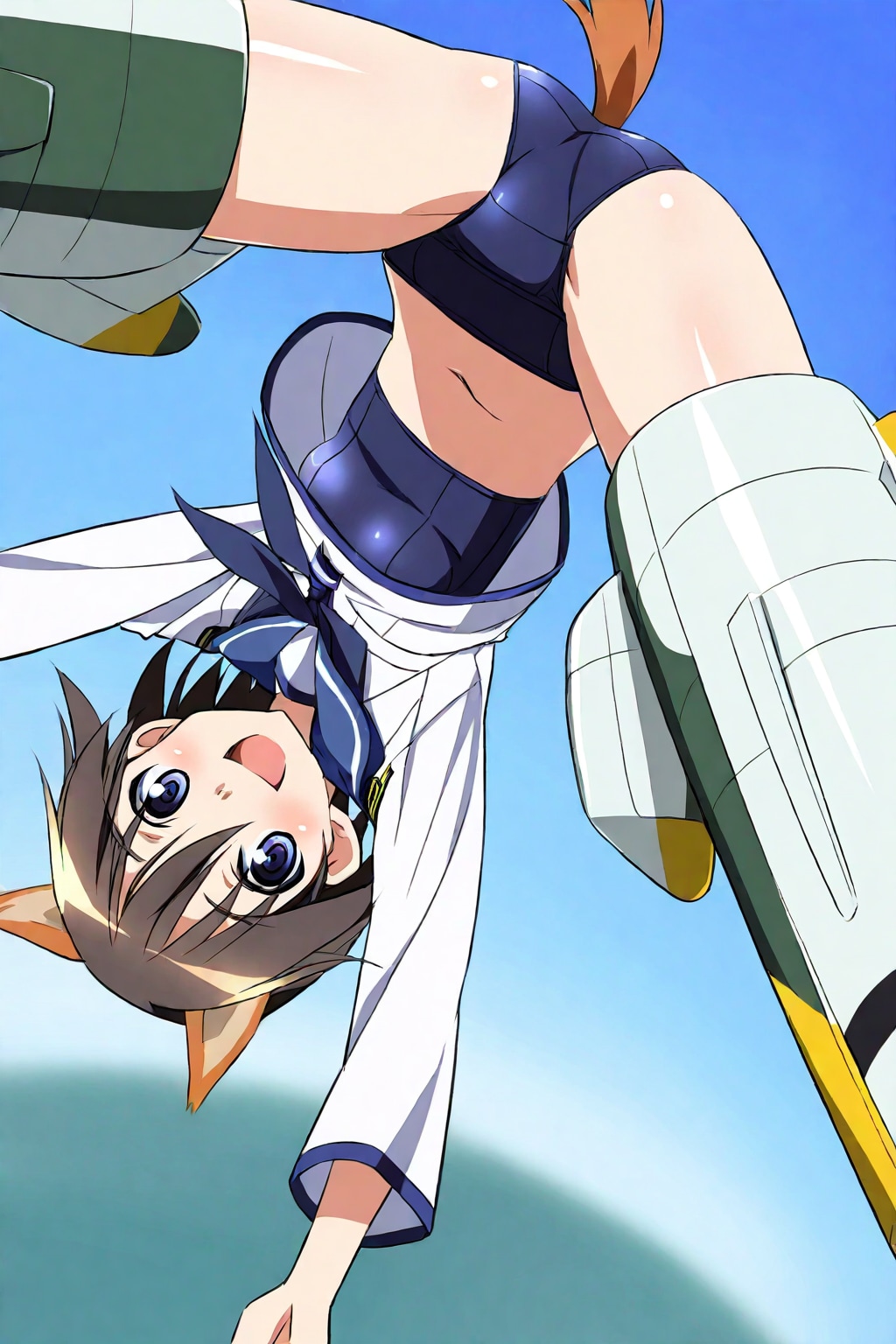 🔔5枚目プロンプト [ Strike Witches, Yoshika Miyafuji, from below:1.3, spread legs:1.2, smile, flying, striker unit,