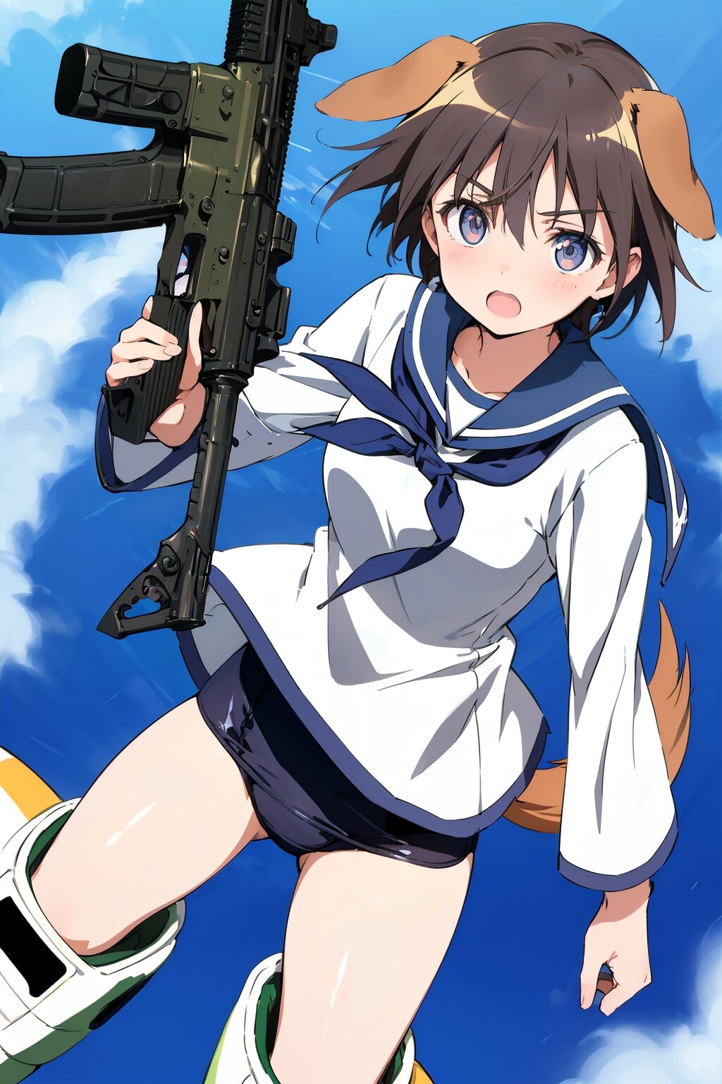 🔔4枚目プロンプト [ Strike Witches, Yoshika Miyafuji, from below:1.3, spread legs, smile, flying, striker unit, (dog ears, dog tail, bare legs),