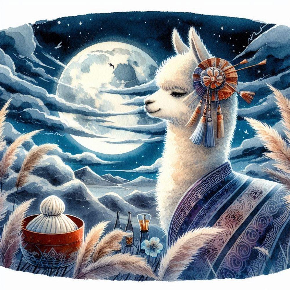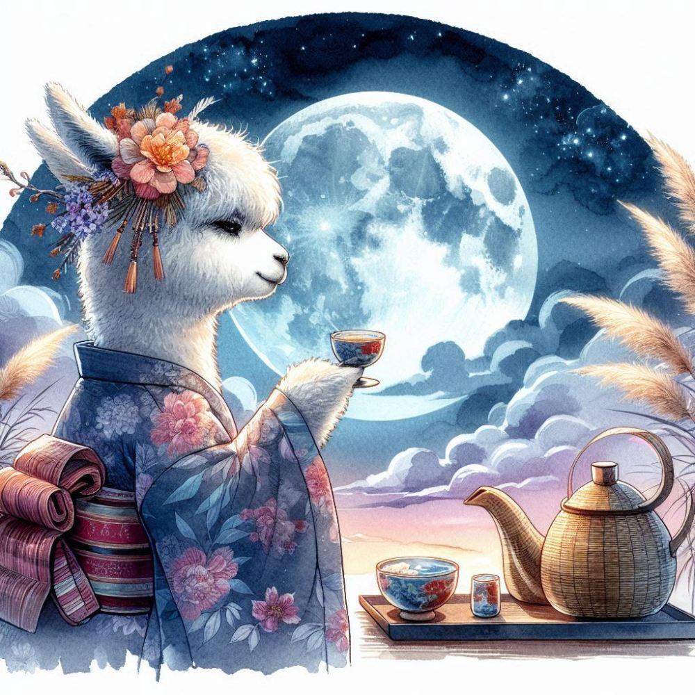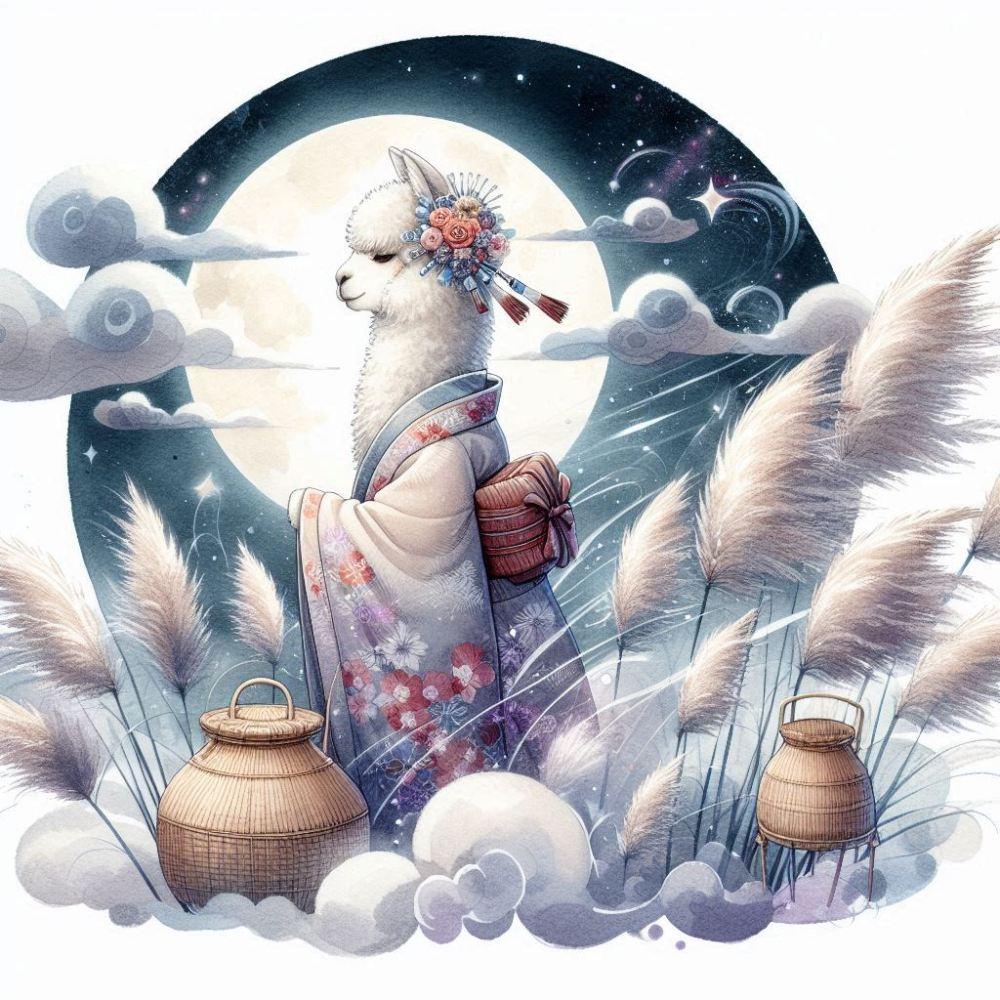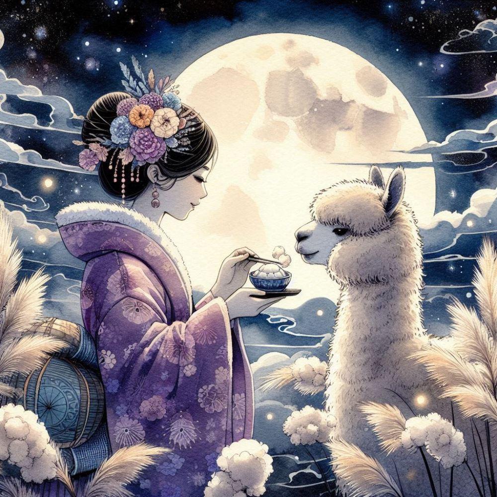 水彩水墨画ファンタジー、お月見する髪飾りをつけた着物アルパカ