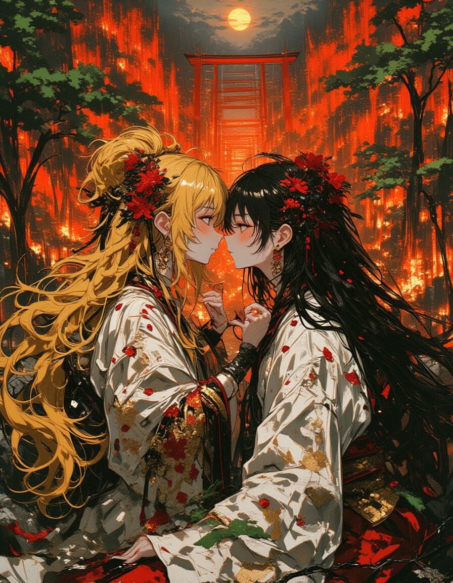 真っ赤な彼岸花が髪留めの如く頭に咲き誇り、身体中に呪詛のようなものが書かれた包帯が巻かれ、口や目が張り付いた真っ黒な手が纏わりつき、その周囲には赤い鳥居と古びた卒塔婆が立ち並ぶ。
