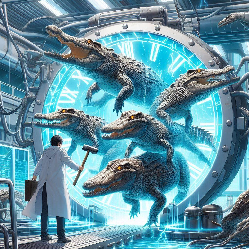 タイムマシンの調整に失敗し、人類が地球に誕生するよりもはるかに前の本物のワニを現代に呼び出してしまったのであった。