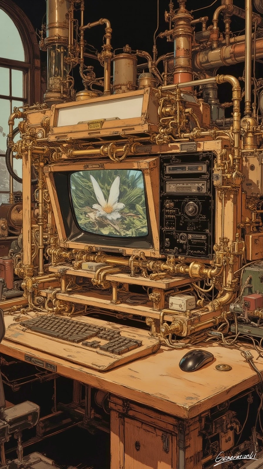 蒸気の唸りと歯車の軋みのなかで、機械は静かに自然を投影し続ける。