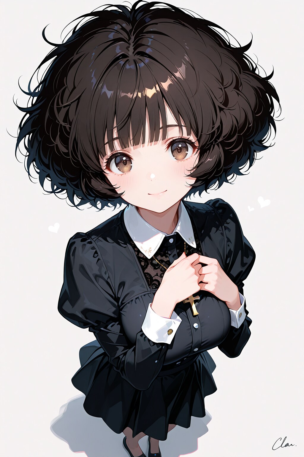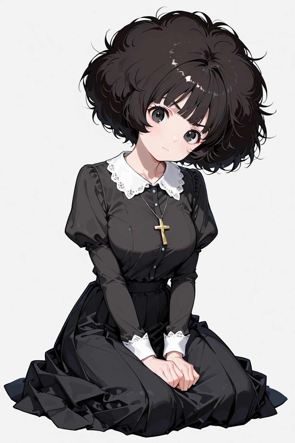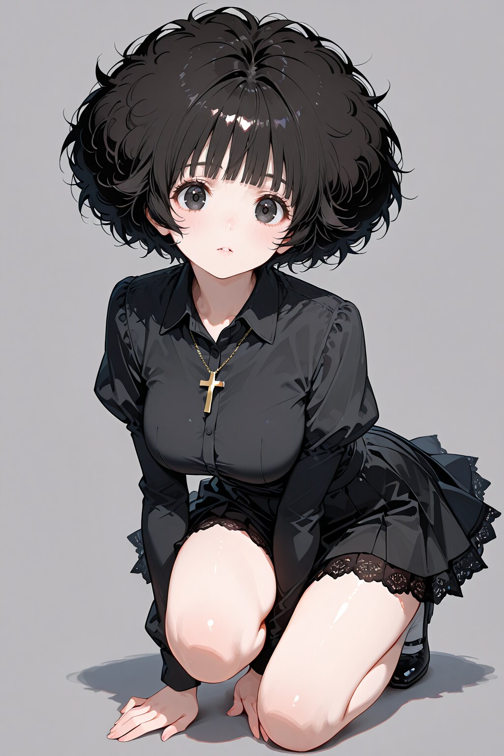 黒髪(こげ茶より)のモコモコ髪の女の子です。
