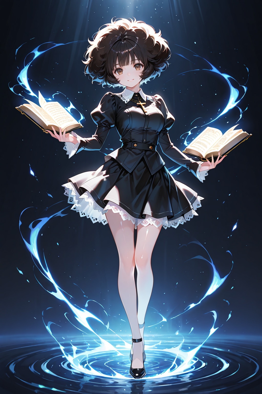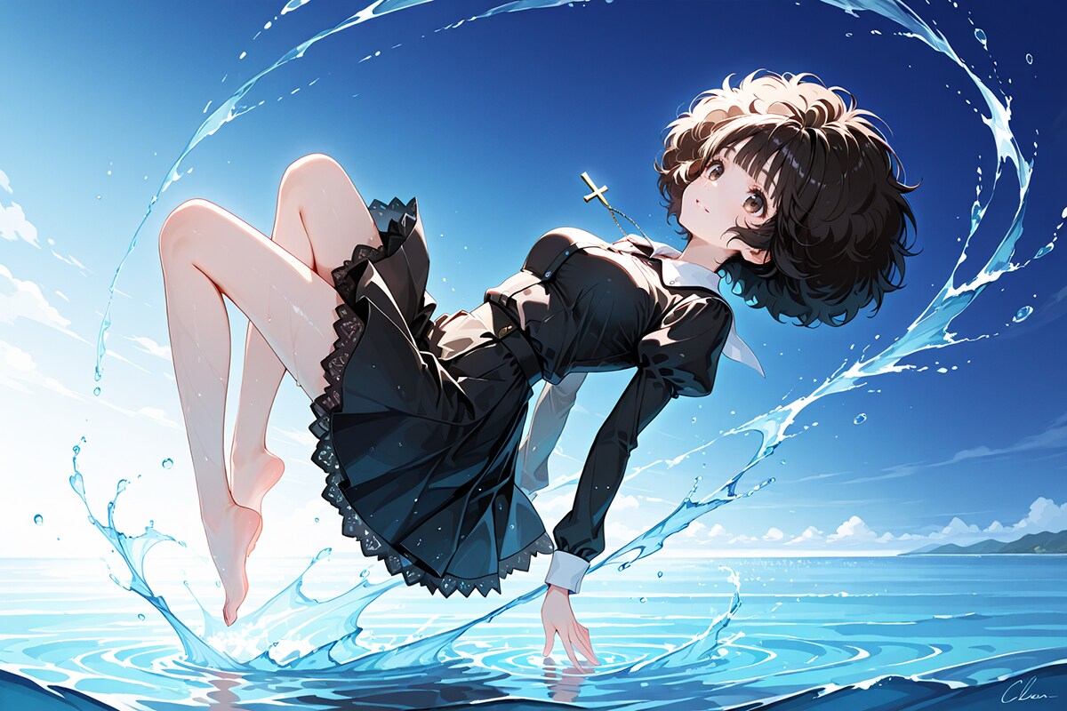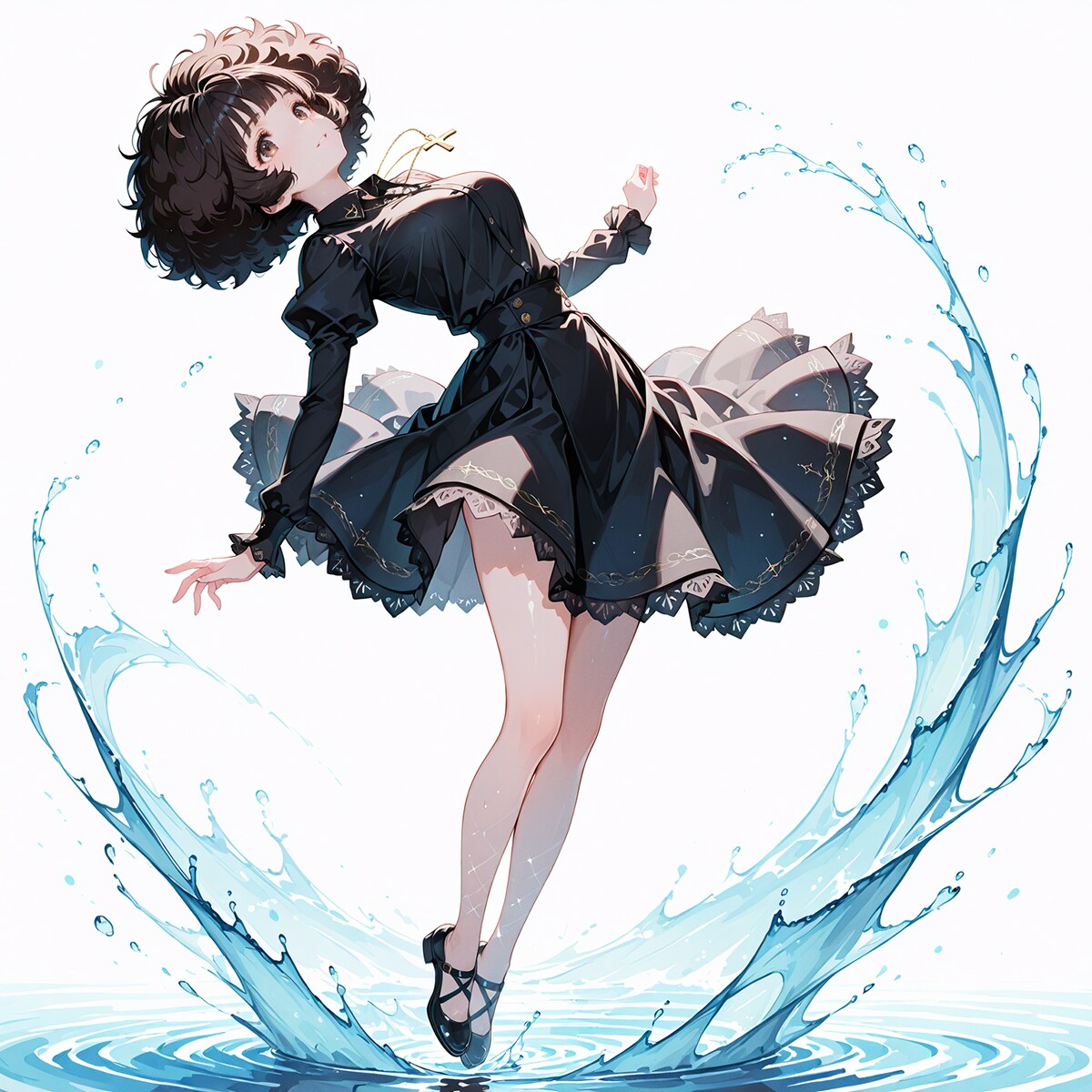 黒髪(こげ茶より)のモコモコ髪の女の子です。