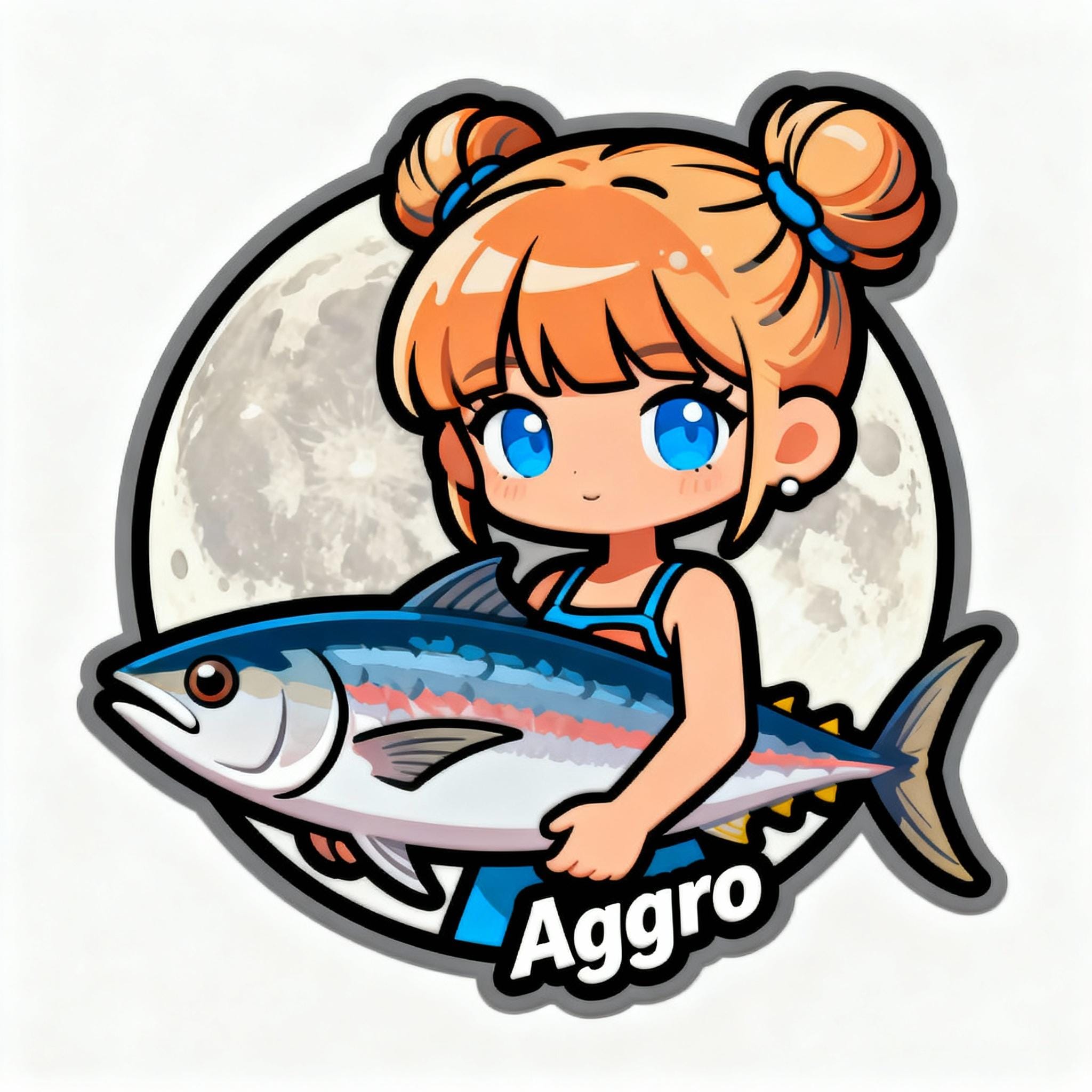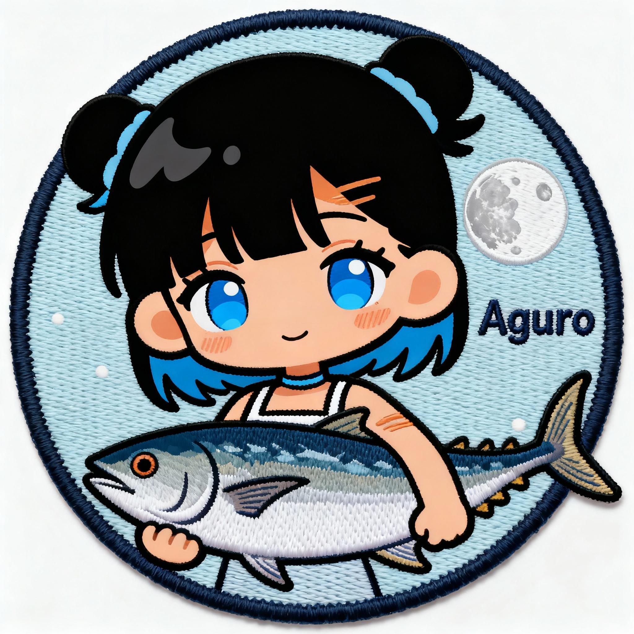 4枚目:日焼けをした黒髪ツーサイドアップの髪型青い目の女の子とマグロと月をモチーフにしたエンブレム デフォルメされていて可愛い "Aguro"の刻印
